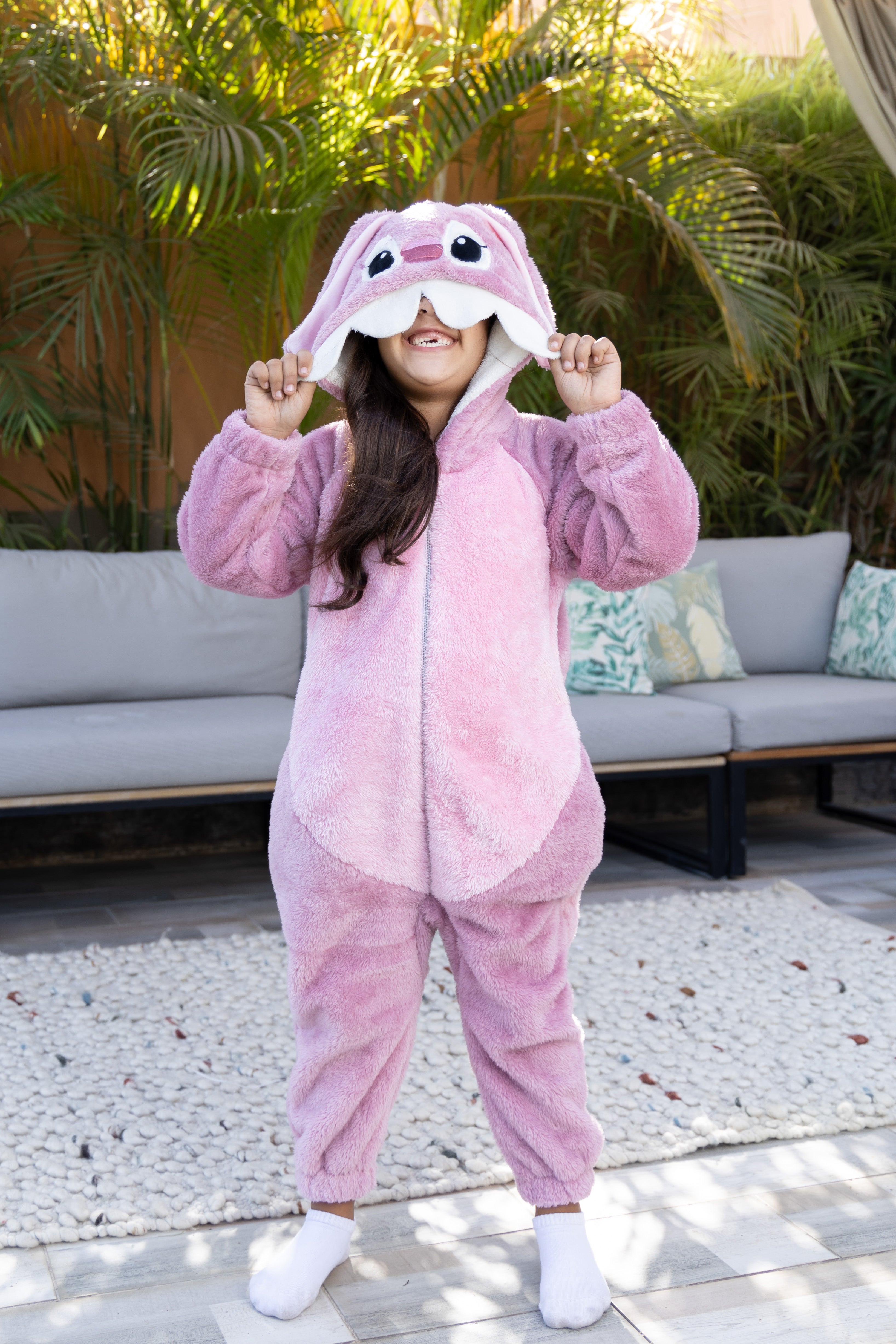 This onesie/kigurumi, perfect for play or sleep, is designed in the shape of the cartoon character "Angel." It's made primarily from raw faux fur (faux fur) or thick fleece and rose Persian rugs. The men's version features a hood shaped like an angel's face, with large eyes, a nose, a mouth, long ears, and graceful features. The onesie closes with a full zipper, making it very comfortable and warm.