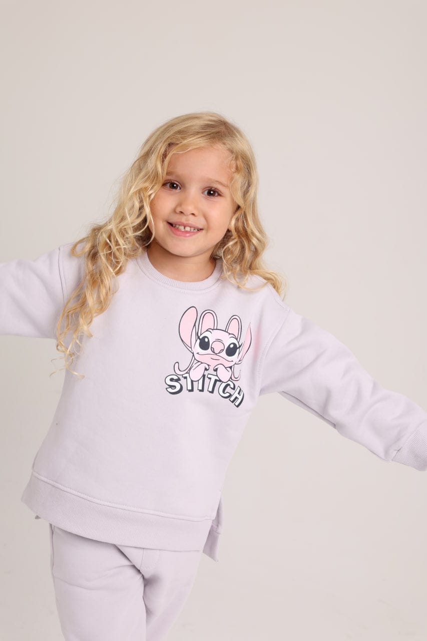 A comfortable girls' athletic or loungewear set in a soothing lavender color. It includes a cozy sweatshirt and matching joggers. The sweatshirt features a print of Angel from Lilo & Stitch on the chest. This set is perfect for everyday comfort and gives your child a cute and soft look in a trendy color.