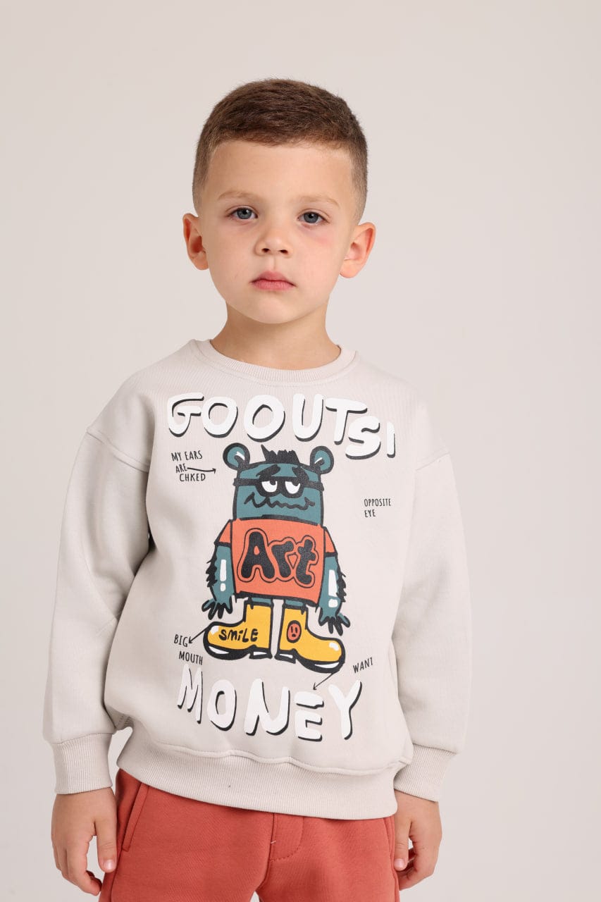 This casual winter outfit for boys features a bold color scheme. It includes a warm, light grey-beige sweatshirt with a fun, artistic graffiti print of a cartoon bear and youthful slogans like "GO OUT!" and "MONEY." It's paired with warm terracotta-colored joggers. This set is perfect for an active day, guaranteeing a stylish and comfortable look.