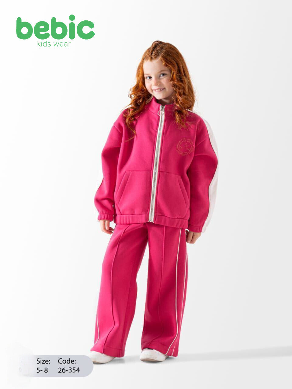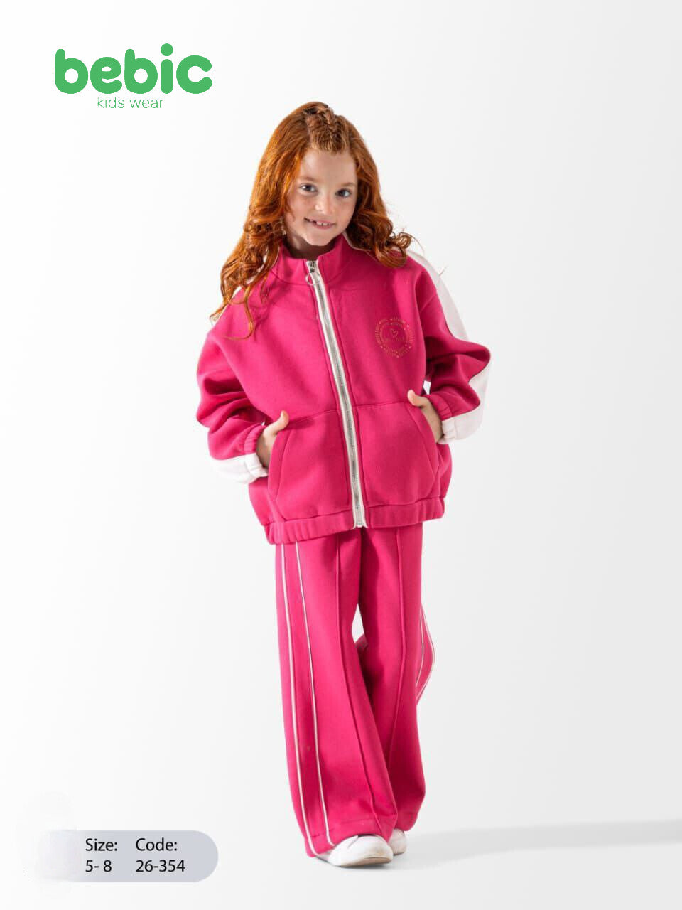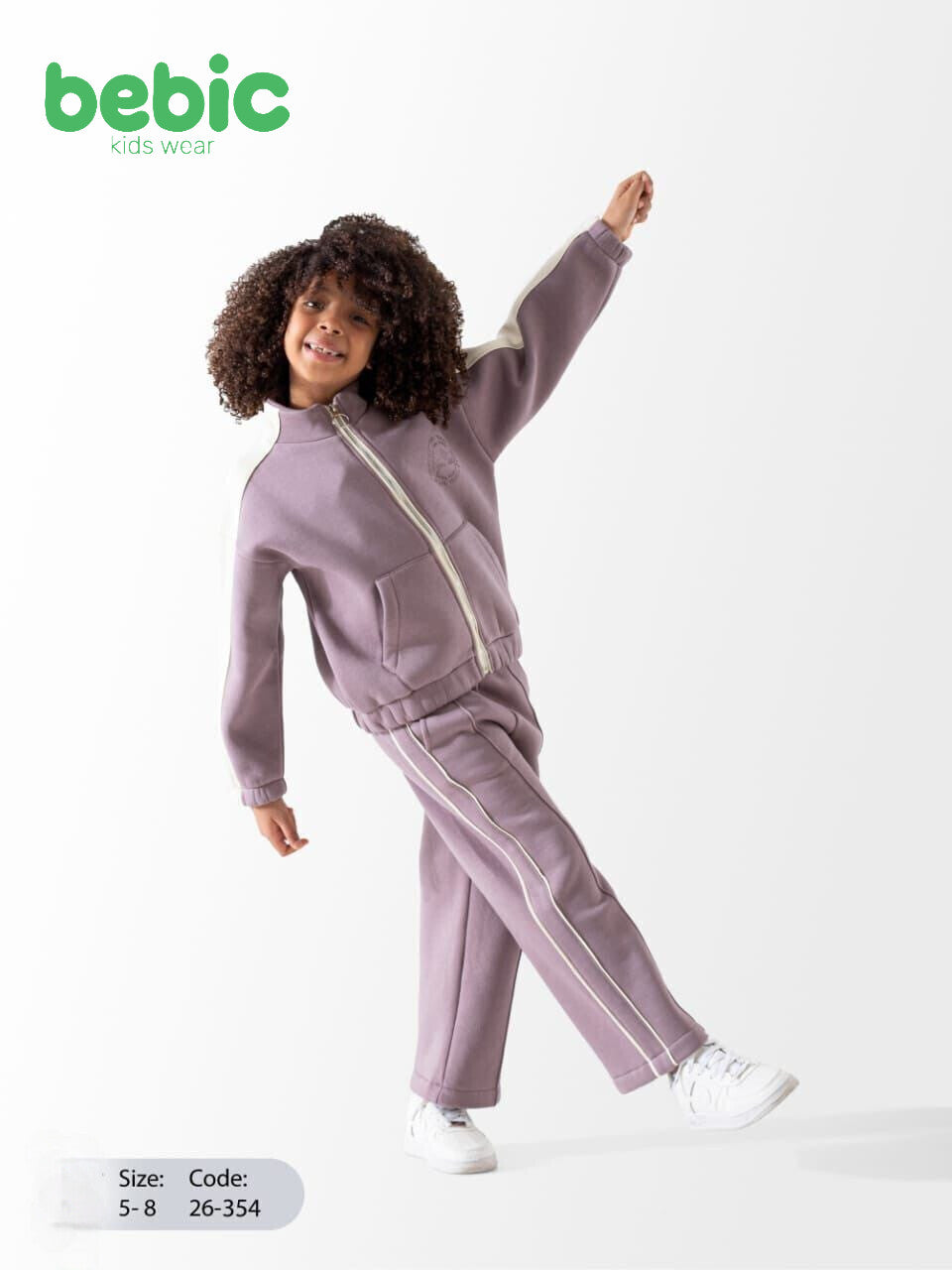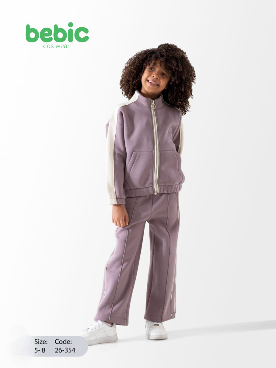 These two girls' tracksuits are identical in design and made from a thick, comfortable cotton blend. Each set includes a high-neck, full-zip front jacket with a classic sporty touch through color-blocking, featuring creamy white sleeves. The wide-leg pants have prominent white vertical stripes running down the sides. The two sets differ only in their base color: one is Dusty Lilac and the other is Fuchsia Pink.