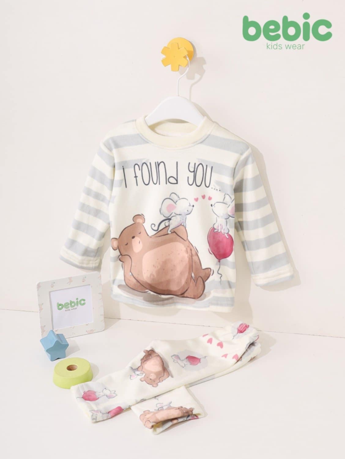 This cute baby pajama set is made from soft, comfortable fabric in gray and white stripes. It features a cute design of a little bear and two mice holding balloons on the front, along with the words "I Found You." The pants are decorated with the same cute graphics, giving the set a cohesive and cuddly look. Perfect for bedtime and lounging, it offers a warm and playful touch.