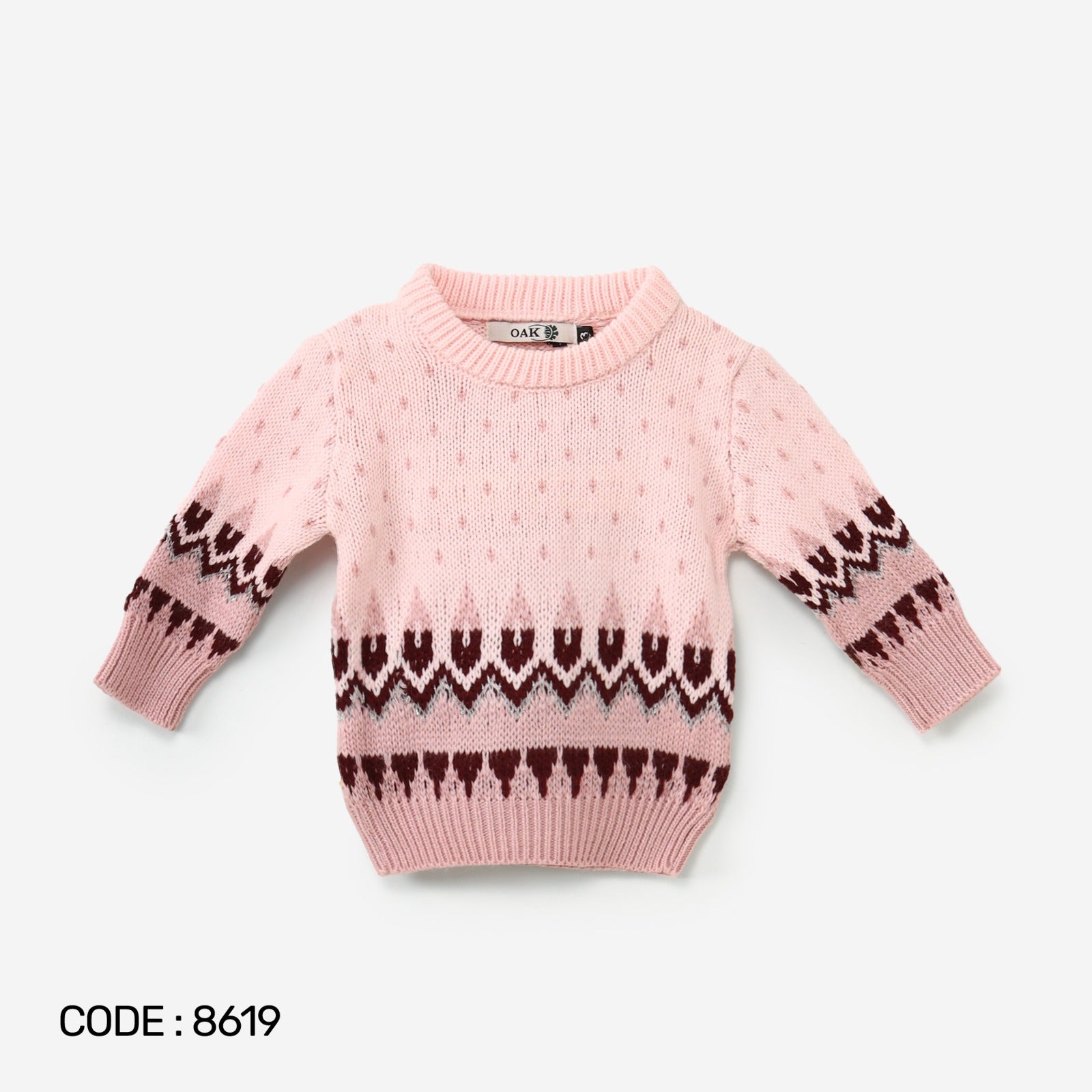 This baby pink winter wool sweater features a Fair Isle pattern on the chest and sleeves, featuring geometric zigzag motifs and triangular shapes in warm shades of burgundy and dark gray. The upper chest and sleeves are adorned with polka dots. The sweater has long sleeves, a round neck, and ribbed hems.