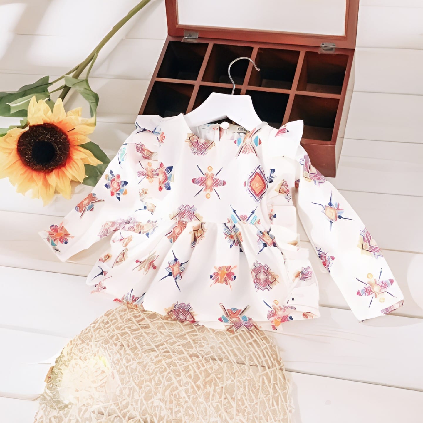 Girls' long-sleeved fall dress, featuring an ivory white base color and a bohemian or ethnic (Tribal/Aztec) print in warm, multi-colored shades of orange, light blue, and pink. The dress features soft, double ruffles at the shoulders and two small side pockets for a practical yet playful touch. A unique and stylish design for the fall season.