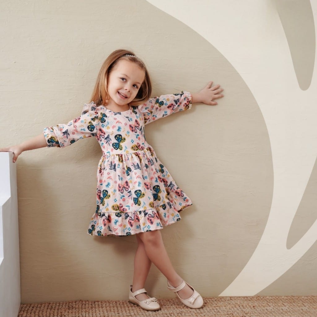 A light fall girls' dress, perfect for mild days. It features a beige/pale pink color and a vibrant, colorful butterfly print. The dress has long sleeves with slightly puffed shoulders, a waist defined by a thin gold ribbon, and a light ruffle hem. The playful and soft design adds a touch of femininity and joy.