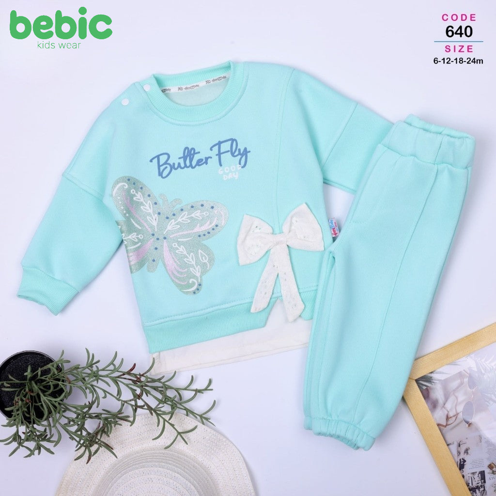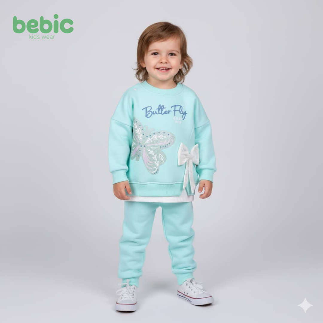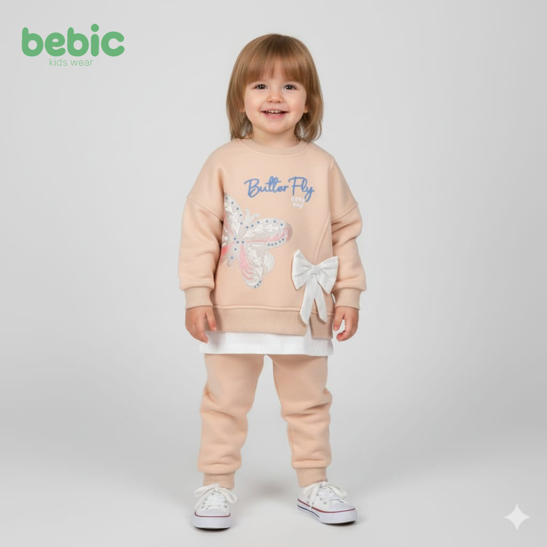 It consists of a sweatshirt and pants made of warm cotton in delicate colors such as pink, beige, and mint. The sweatshirt features a shiny butterfly embroidery with pearl and lace details, and a side bow adds a delicate and elegant touch. A comfortable and practical design is suitable for outings or sitting around the house on cold days.