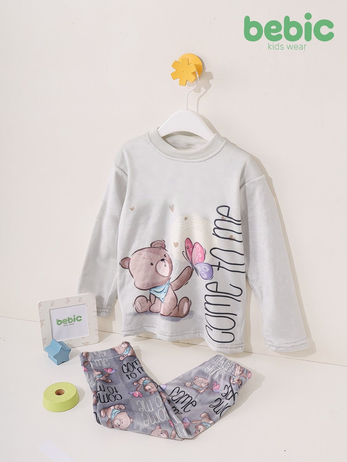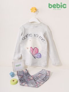 Fashionable and comfortable children's pajamas with a delicate design.This long-sleeved blouse comes in a soft light gray/white color scheme and features a large, colorful butterfly print in pink and purple and the words "come to me" in elegant font at the top. Its design offers warmth and softness.The dark gray pants feature a repeating print and small graphics that reflect the cute character of the pajamas. The word "LOVE" appears on the front, giving the set a cute and coordinated look. The fabric is ideal for children's sensitive skin, ensuring optimal comfort.