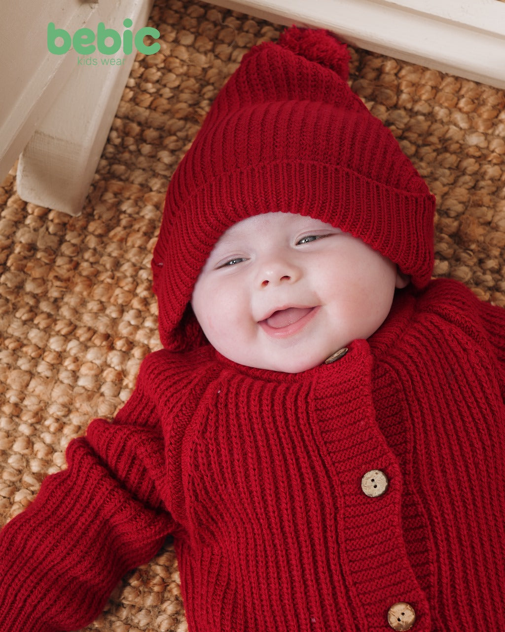 A stylish and cozy winter outfit for newborns in a rich cherry red. This set includes a jumpsuit or matching set (cardigan and pants) in a ribbed knit, featuring light wooden buttons for a classic touch. A warm winter hat with a pom-pom completes the look. Perfect for a festive and comfortable outfit, it provides extra warmth for your baby this winter.