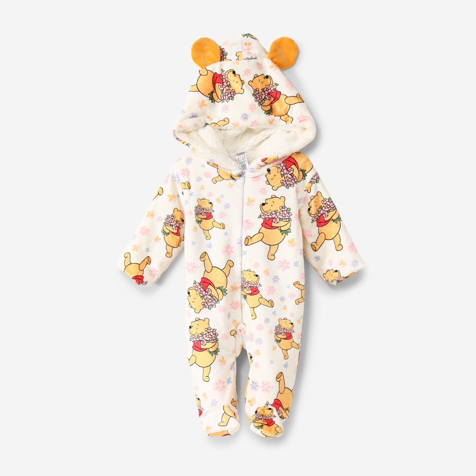 The bodysuit is made from soft, warm, creamy white fabric and is printed with a cute teddy bear holding a bouquet of flowers. It features a hood with tiny orange ears for a playful touch, and a front zipper for easy on and off. Its practical and soft design is ideal for keeping infants warm and cozy, with an attractive shape that's suitable for children.