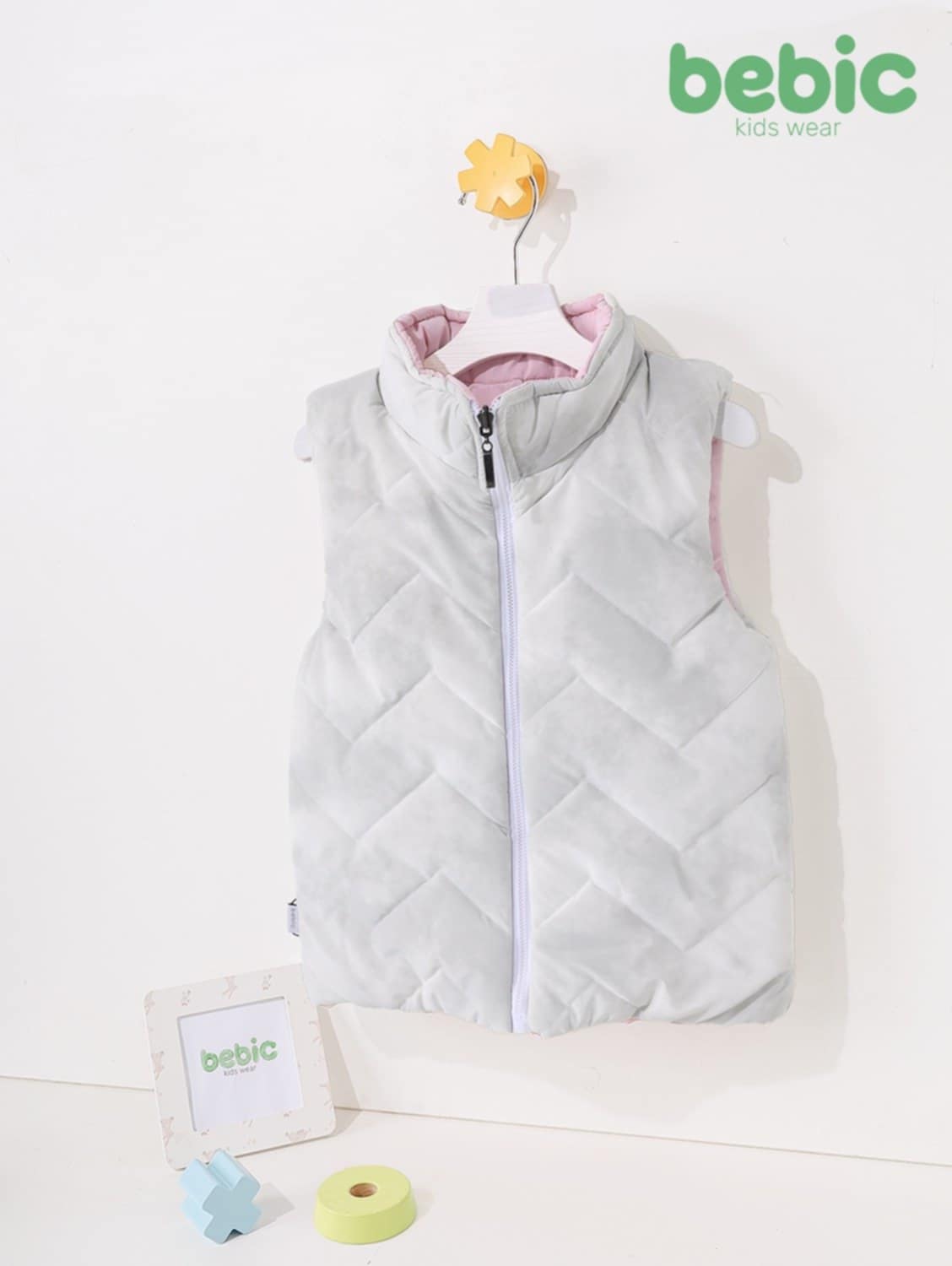 A stylish double-faced vest with a modern design that combines softness and warmth, made with a comfortable quilted fabric ideal for winter days. It features a practical front zipper and a sophisticated touch, making your child ready for every outing with a stylish yet comfortable look. It's perfect for coordinating with any casual or winter outfit.