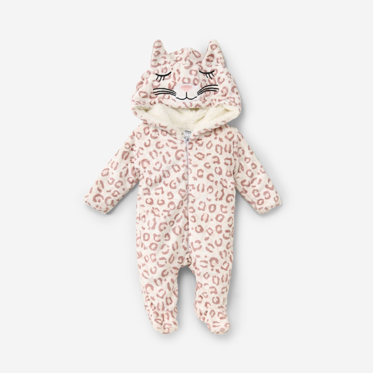 This winter romper for babies is lined with soft sherpa fleece for ultimate warmth. It features a pink and light beige leopard print. The hood is designed with a cute cat/tiger face, complete with floppy ears and embroidered sleepy eyelashes. It has closed feet and a full front zipper for easy dressing. It combines style with extra warmth.