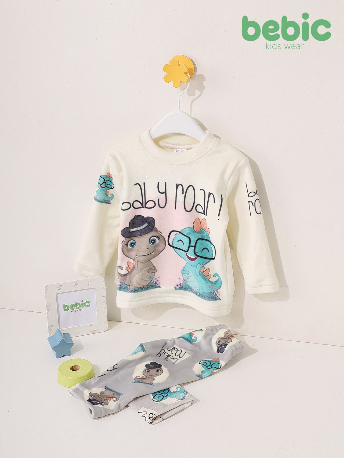A warm and quilted winter set from Bebic, suitable for children from 6 months to 3 years. The off-white T-shirt features a playful print of dinosaurs wearing glasses and hats, along with the phrase "baby roar!" (baby roar). The light gray pants feature a repeating dinosaur pattern. This set provides the necessary warmth and softness for your child during winter nights.