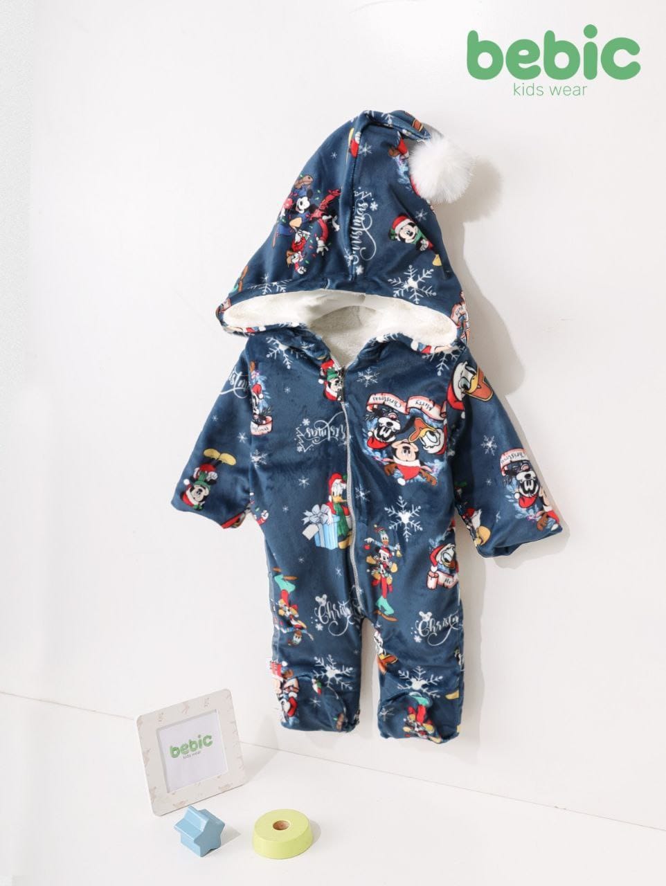 A warm, fleece-lined winter romper for children, made from luxurious navy velvet. It features a thick, all-over print of beloved Disney characters like Mickey and Minnie Mouse in their festive Christmas outfits, along with illustrations of gifts and snowflakes. The hat has a cute white pom-pom. Perfect for winter occasions and holidays.