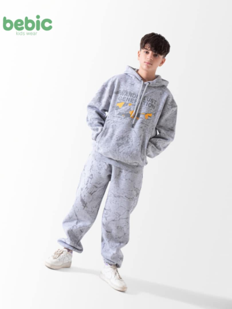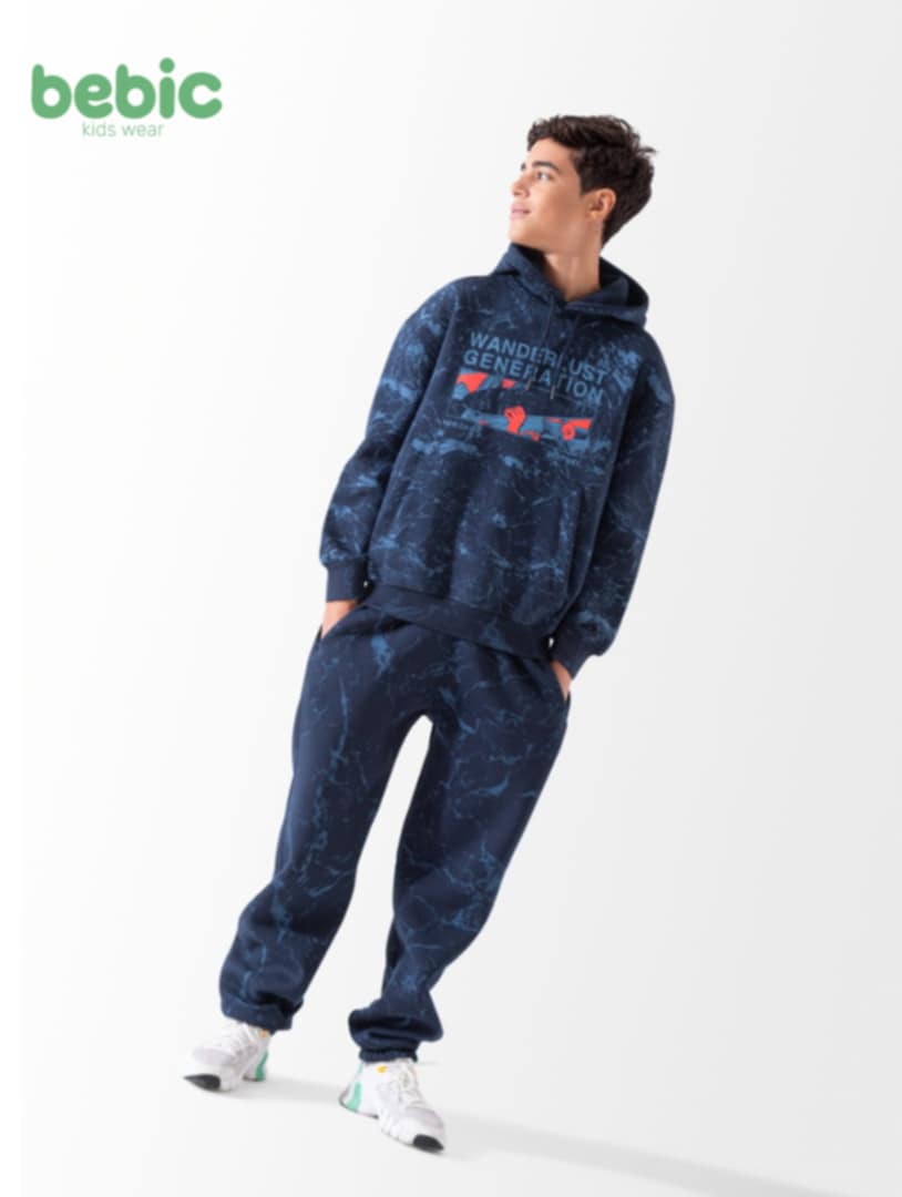 The set is a youthful winter suit consisting of a hoodie and pants with a distinctive marble pattern and an attractive front print bearing the phrase "Wanderlust Generation," expressing the spirit of adventure and freedom. The material is soft and warm, providing complete comfort and a modern look that's perfect for everyday looks.