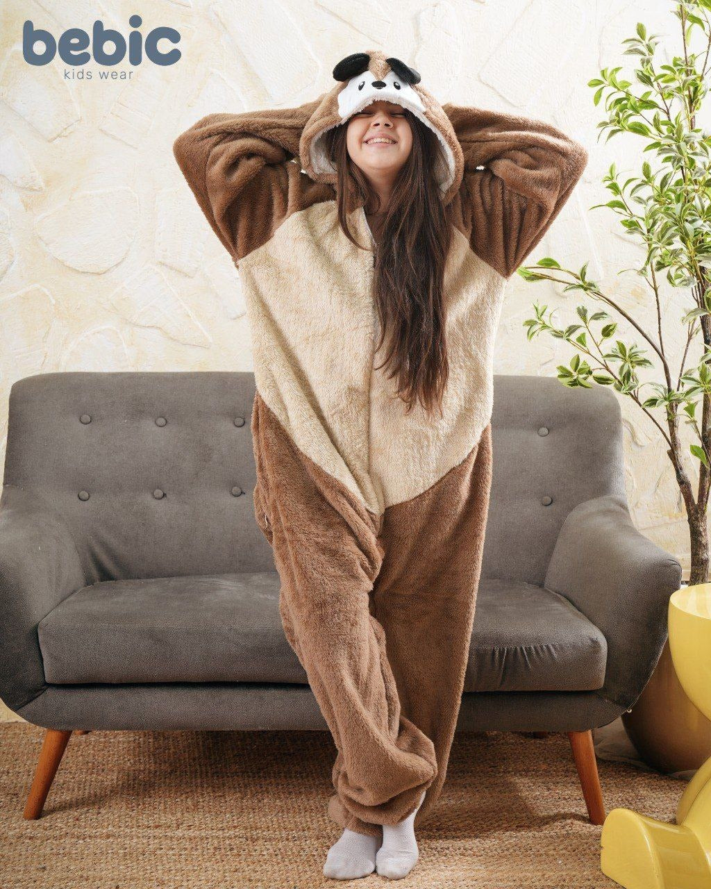 This is a full-length Kigurumi costume made from soft polar fleece in beige and light brown. It features a cute fox design, with a lighter-colored belly area and a hat that holds the fox's head with detailed nose and ears. The costume is loose and comfortable, closes with a front zipper, and is perfect for staying warm and playing.