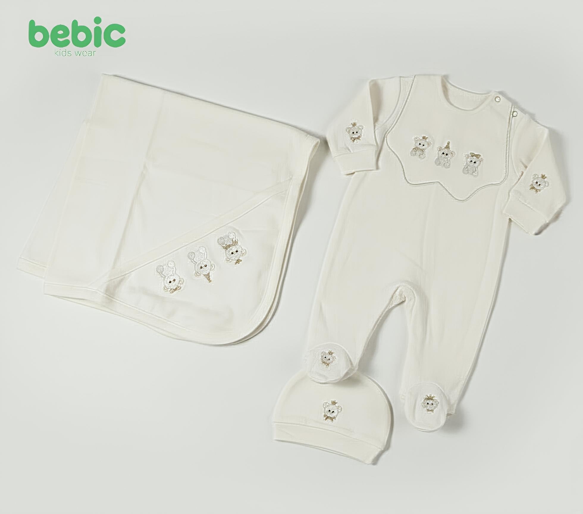 تُعدّ هذه المجموعة خيارًا مثاليًا لأيام طفلكِ الأولى، فهي تتميز بلون أبيض كريمي أنيق يُضفي لمسة من الفخامة الكلاسيكية. تتضمن المجموعة ثلاث قطع متكاملة: بذلة بتصميم فريد، وقبعة ناعمة، وقماط متناسق. تتميز البذلة بصدريتها الداخلية ذات الحواف المُزخرفة، والمطرزة بثلاثة خراف صغيرة ترتدي تيجانًا وأقواسًا ذهبية - وهو نقش يتكرر بجمال على حواف القماط والقبعة والقدمين. صُنعت المجموعة من قطن فاخر يجمع بين النعومة الفائقة والمتانة، وتتميز بأزرار جانبية عند الرقبة لسهولة الارتداء. إنها تجمع بين الأناقة والراحة، لتُخلّد ذكرى عزيزة لأيام طفلكِ الأولى.