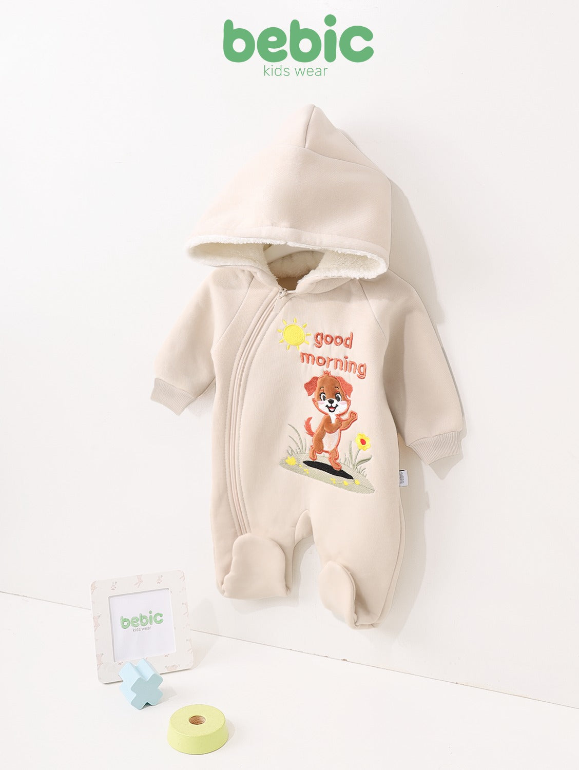 A winter romper for newborns in a neutral off-white color. The romper features a hood and a full front zipper for easy dressing and undressing. It's made of thick, soft sherpa fleece, both inside and in the hood, providing maximum warmth. The front is decorated with a playful embroidered dog and the words "good morning." The feet are covered to keep the baby cozy.