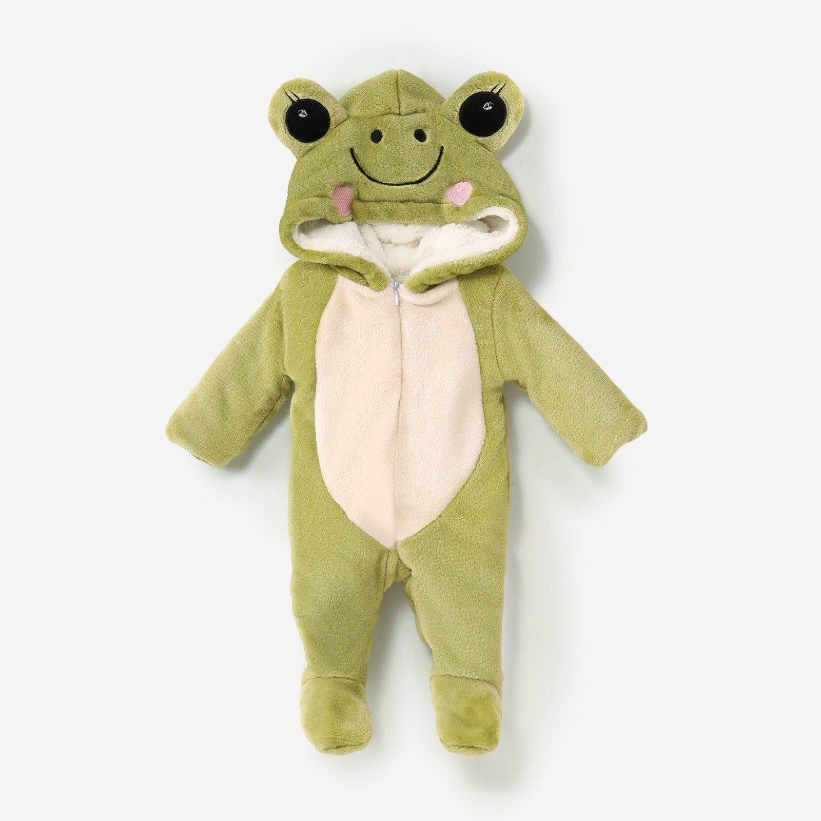 Made from soft green fabric, this jumpsuit features a cute frog design all over. It features a hood featuring a smiling frog face with pop-out eyes and rosy cheeks for a playful touch. The front is light beige to mimic a frog's tummy, with a front zipper for easy dressing. The warm and cozy design gives your child a cute and distinctive look.
