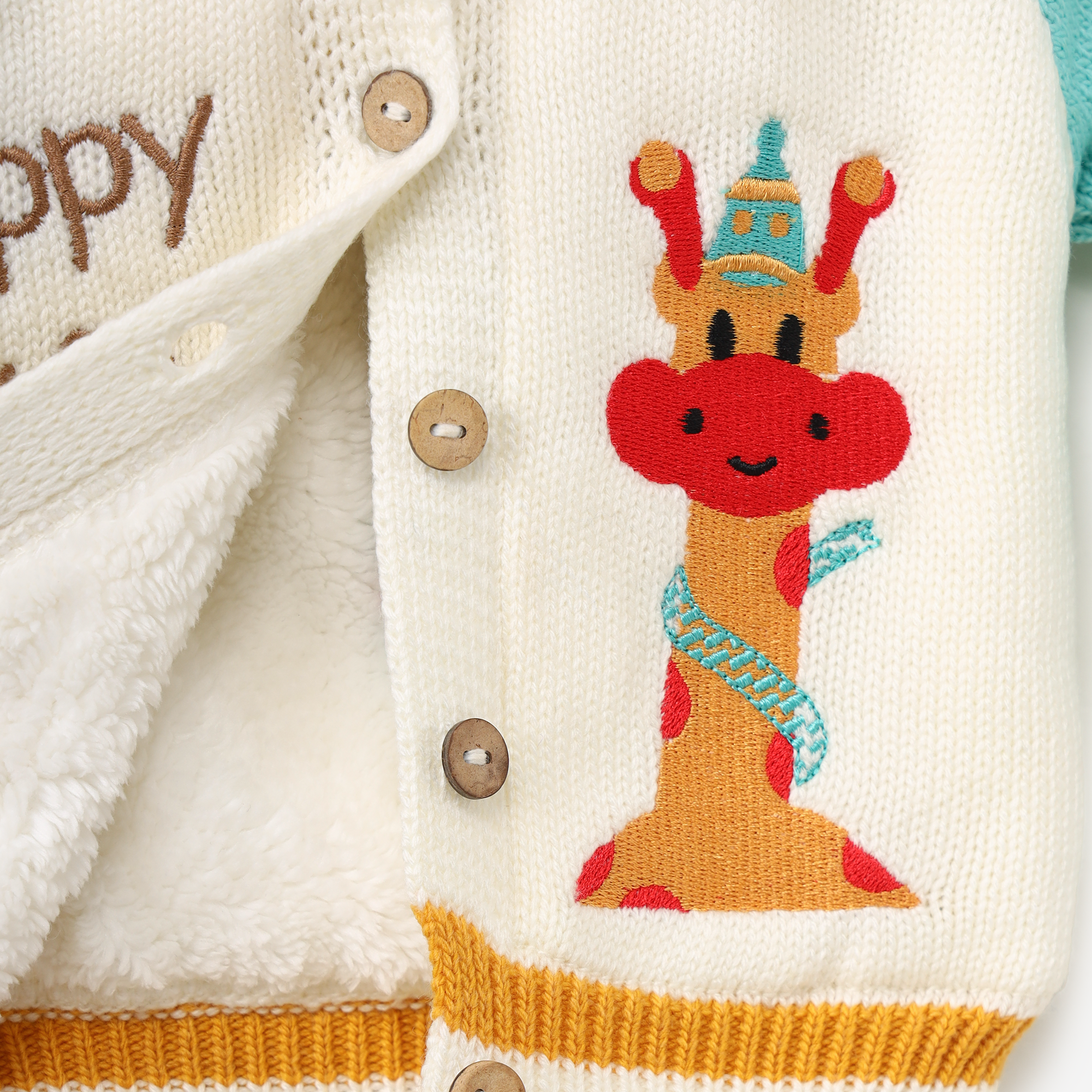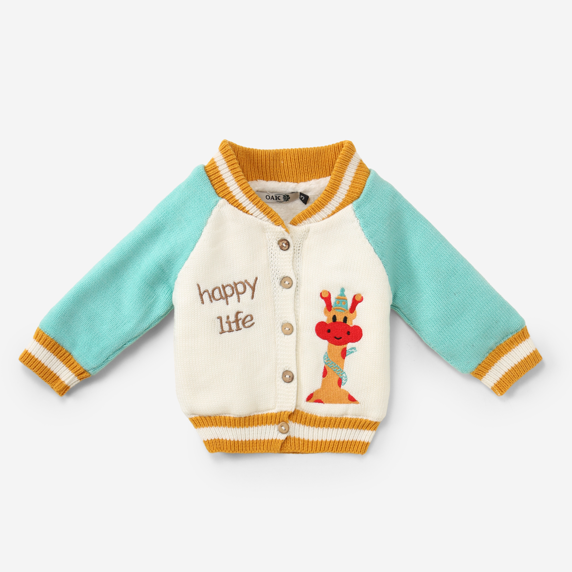 A sporty bomber jacket for children in cheerful colors. It features a light beige center with turquoise sleeves, and a mustard yellow collar and cuffs with white stripes. It features a "happy life" embroidery and a playful giraffe motif. Suitable for both genders from newborn to one and a half years old. It has a modern and comfortable design.