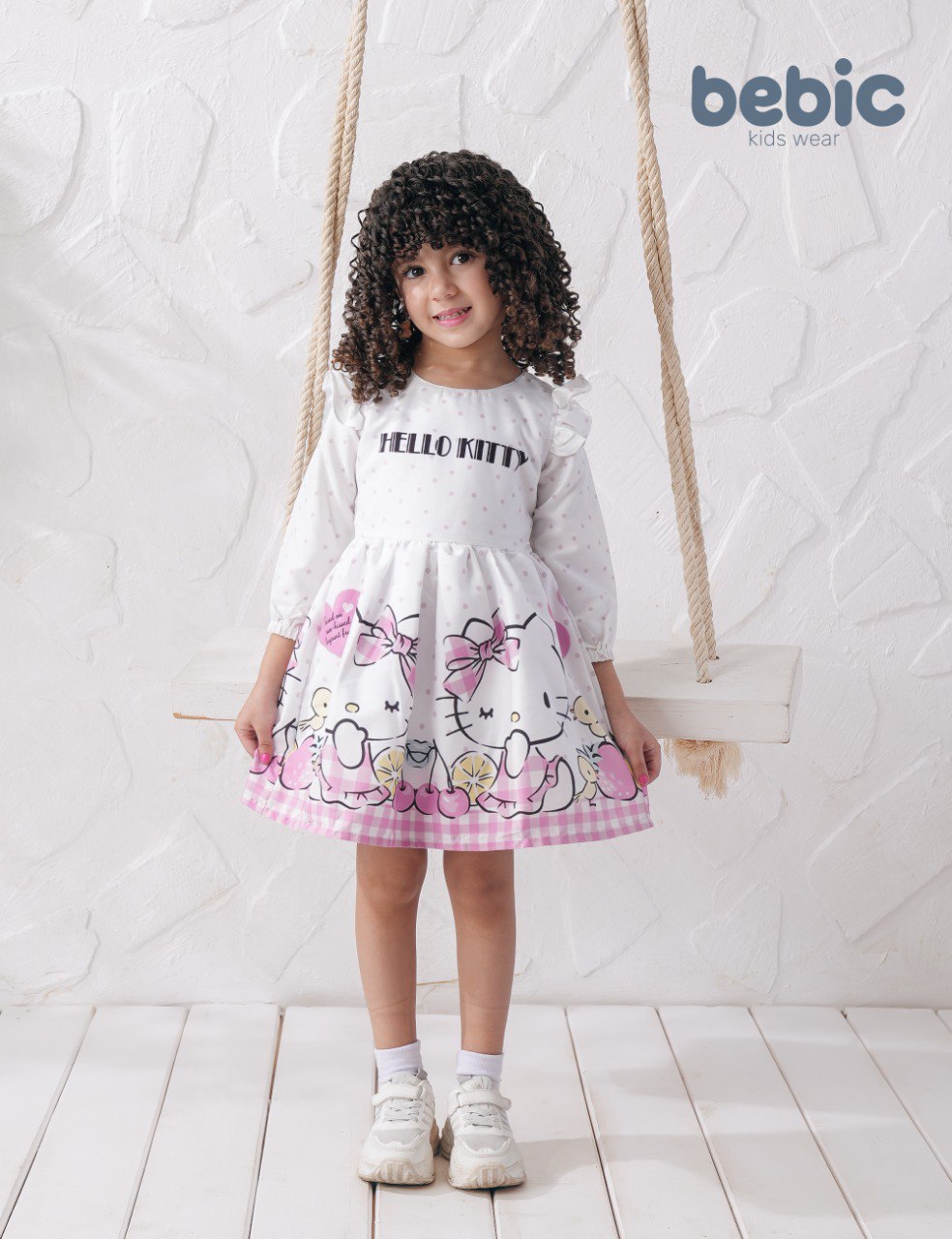 This is a cute white Hello Kitty fall dress for toddlers from Bebic Kids Wear. The dress features light pink polka dots and a fitted waist. The top has the word "HELLO KITTY" in black lettering. The bottom features a large Hello Kitty print with a pink bow. The design is completed with a pink and white checkered hem. The dress has three-quarter sleeves with ruffles at the shoulders. The toddler wears it with white sneakers and socks.