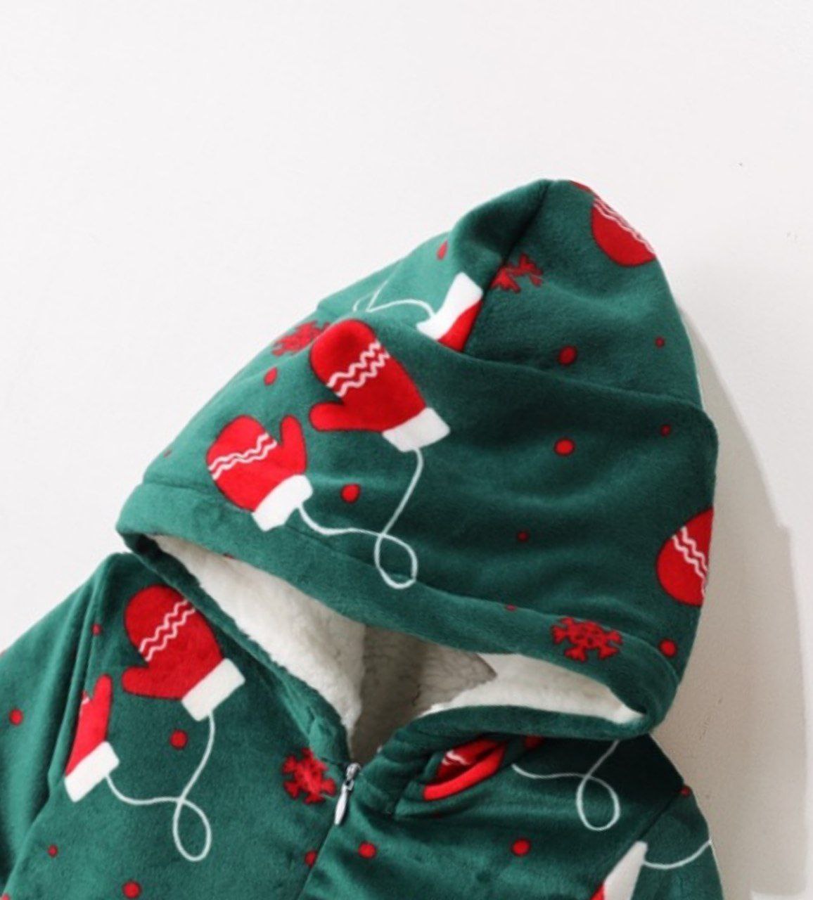 This warm, festive jumpsuit is made from bright green velvet, perfect for the Christmas season. It features a repeating print of red and white mittens with their white cords, along with red flowers, giving it a cheerful wintery look. The jumpsuit is fully lined with a soft white sherpa fleece. It covers the feet, has a hood for protection from the cold, and fastens with a front zipper. It feels thick and cozy.
