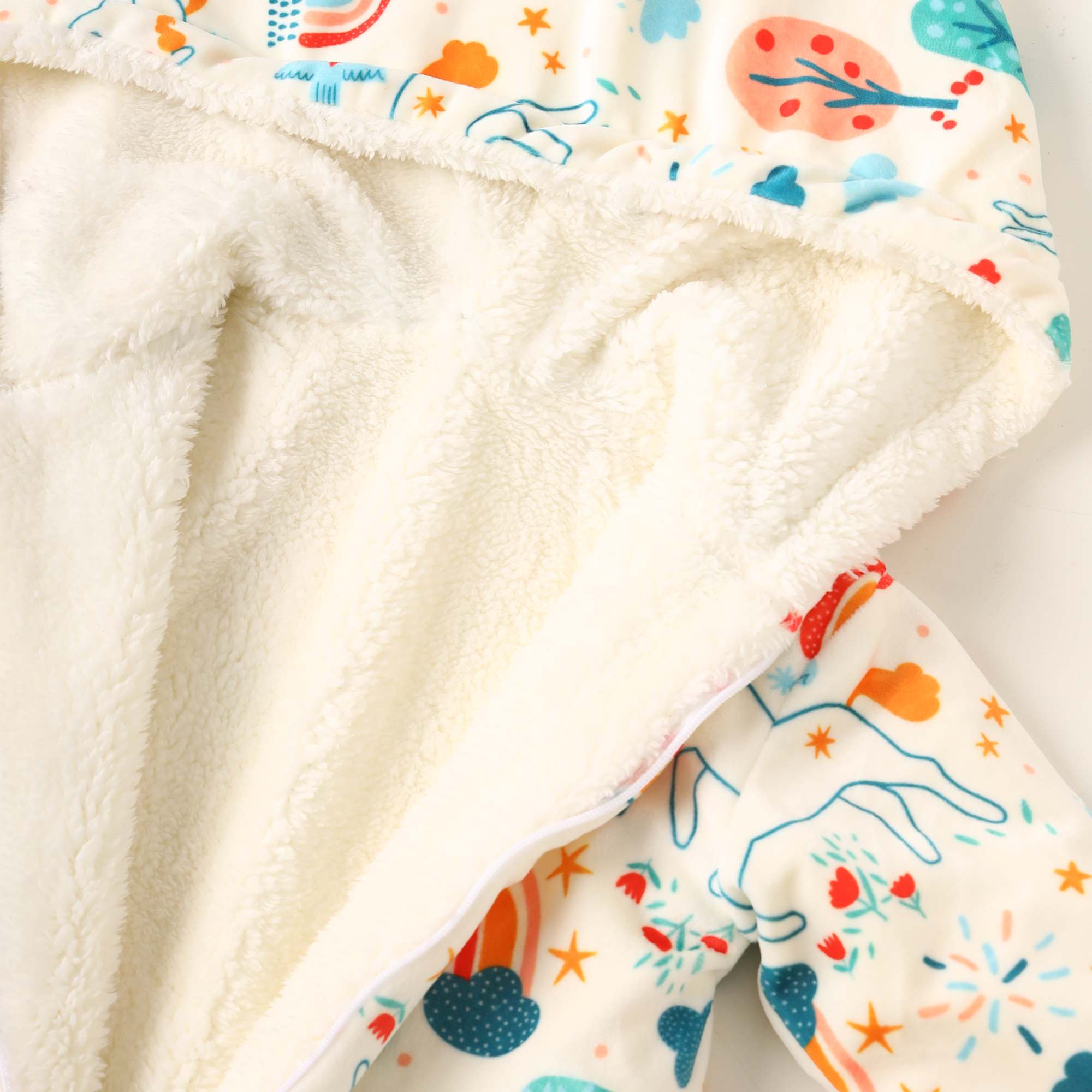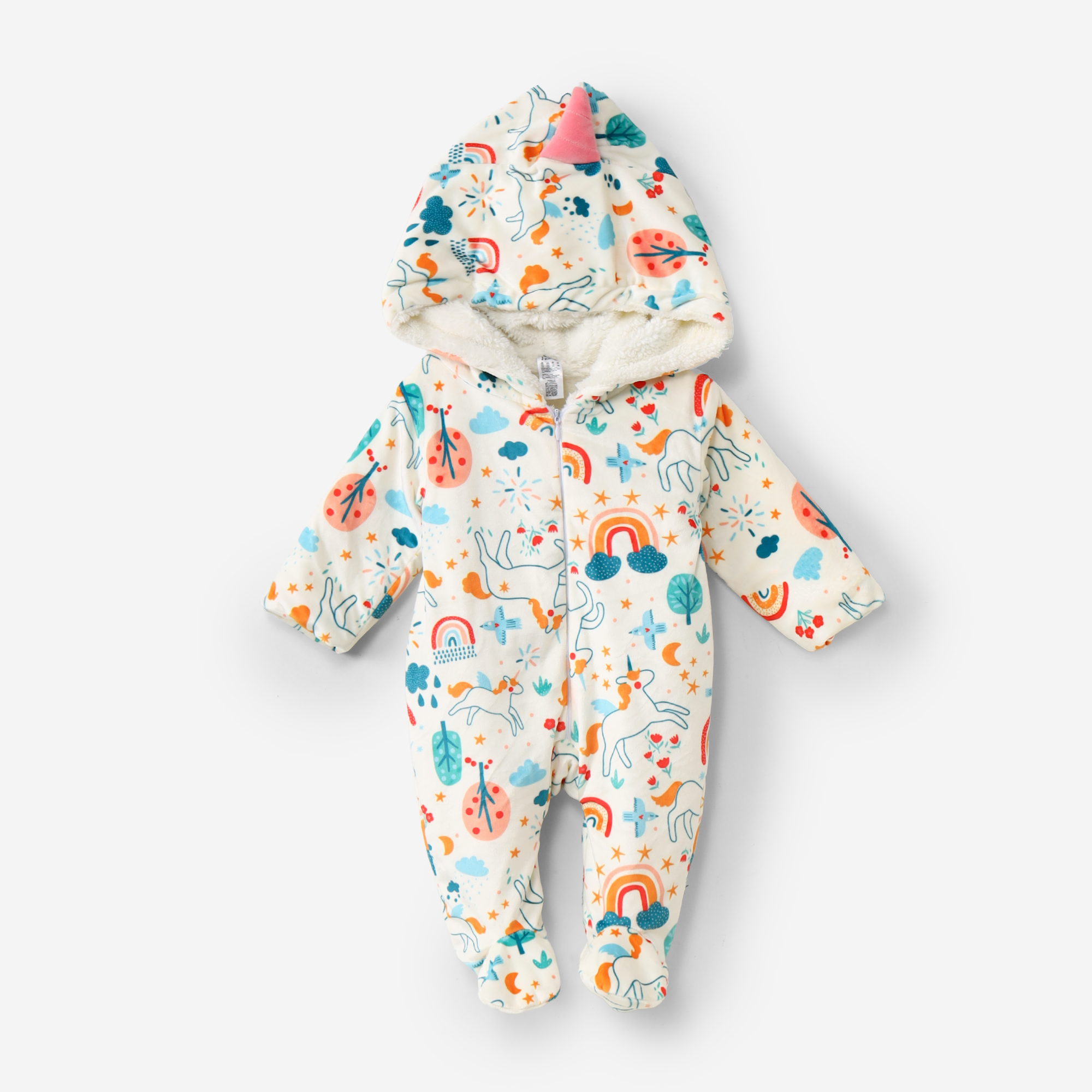 This soft, unisex quilted winter bodysuit is suitable for newborns up to 1.5 years. Its base color is ivory white and covered in a fun and colorful print of unicorns, rainbows, and stars. It features a textured hat with a pink unicorn horn and is lined with soft white faux fur for extra warmth. It features a full zip front for easy dressing and changing and has enclosed feet for total warmth.