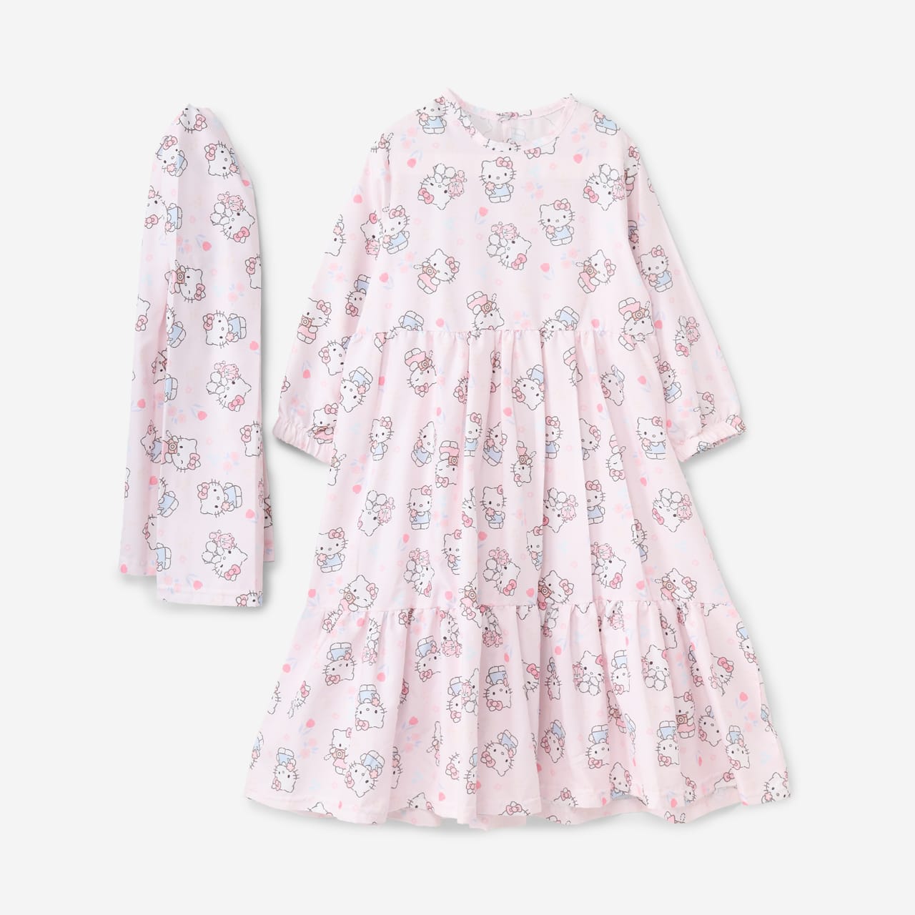 يجمع هذا الفستان الوردي الرقيق بين براءة الطفولة وتصميم عصري مريح، مزين بطبعة كاملة لشخصية هيلو كيتي المحبوبة، ليضفي لمسة من الرقة والبهجة على أي إطلالة. يتميز الفستان بقصة فضفاضة متعددة الطبقات تتيح حرية الحركة والمرح، بالإضافة إلى أكمام طويلة تنتهي بأساور مطاطية ناعمة وفتحة رقبة دائرية بسيطة. ما يجعل هذه القطعة مميزة حقًا هو الحجاب المتناسق (غطاء الرأس) بنفس الطبعة واللون، ليُشكّل طقمًا متكاملًا يجمع بين الحشمة والأناقة بطريقة تُحبها الأطفال. يتميز القماش بنعومته وخفة وزنه، مما يجعله الخيار الأمثل لنزهات الصيف والاحتفالات غير الرسمية، ليمنح طفلتك الصغيرة إطلالة مشرقة تعكس روحها المرحة وشغفها بشخصياتها الكرتونية المفضلة.