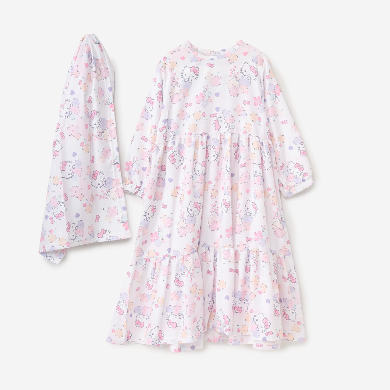 يجمع هذا الفستان الوردي الرقيق بين براءة الطفولة وتصميم عصري مريح، مزين بطبعة كاملة لشخصية هيلو كيتي المحبوبة، ليضفي لمسة من الرقة والبهجة على أي إطلالة. يتميز الفستان بقصة فضفاضة متعددة الطبقات تتيح حرية الحركة والمرح، بالإضافة إلى أكمام طويلة تنتهي بأساور مطاطية ناعمة وفتحة رقبة دائرية بسيطة. ما يجعل هذه القطعة مميزة حقًا هو الحجاب المتناسق (غطاء الرأس) بنفس الطبعة واللون، ليُشكّل طقمًا متكاملًا يجمع بين الحشمة والأناقة بطريقة تُحبها الأطفال. يتميز القماش بنعومته وخفة وزنه، مما يجعله الخيار الأمثل لنزهات الصيف والاحتفالات غير الرسمية، ليمنح طفلتك الصغيرة إطلالة مشرقة تعكس روحها المرحة وشغفها بشخصياتها الكرتونية المفضلة.