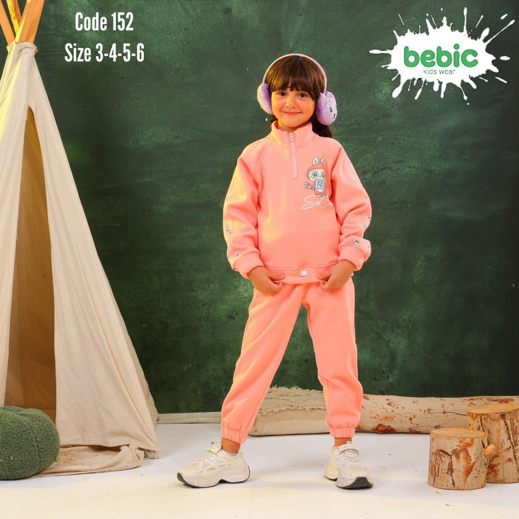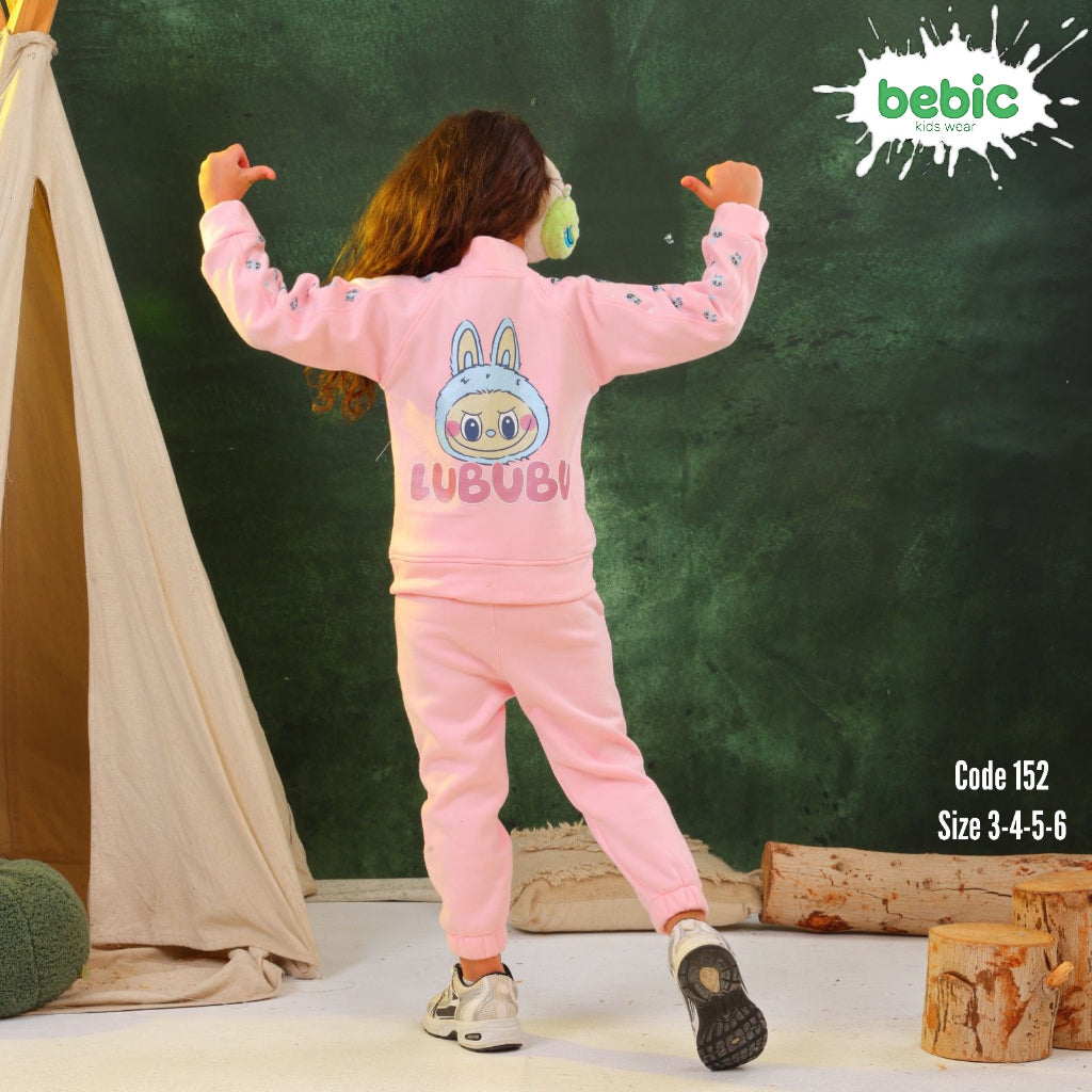 A trendy girls' winter set consisting of a zip-up sweatshirt with a cute cartoon character print and matching pants in a comfortable and practical design. Featuring a cute graphic on the back and sleeves, the soft, warm fabric is perfect for winter days.