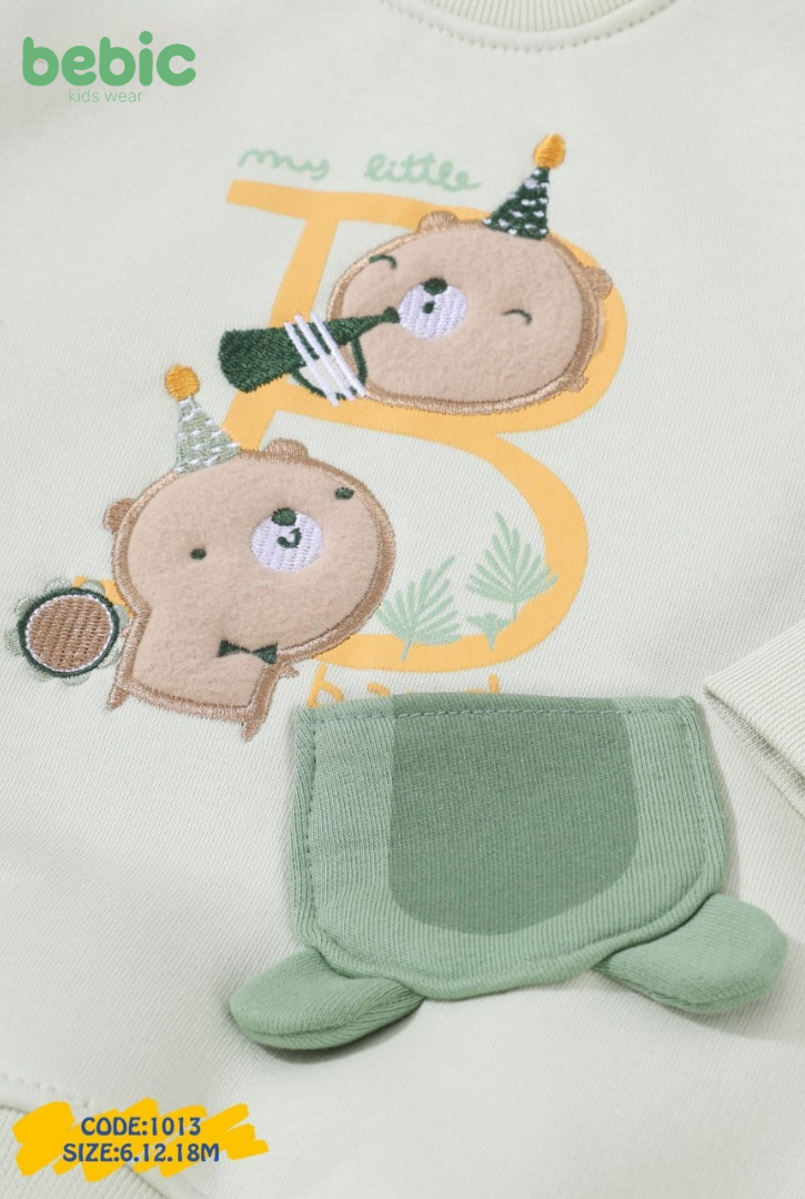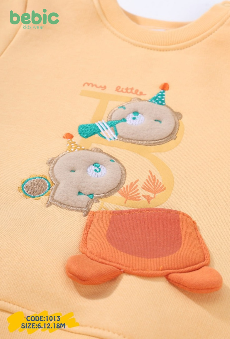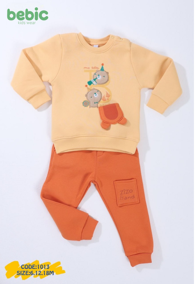 Stylish and comfortable children's pajamas, featuring a sweatshirt with a cute print of playful characters that adds a cheerful touch, along with a small front pocket with a distinctive design. They come with practical pants with a stylish side pocket that adds a simple, modern touch. Made of soft fabric, they provide warmth and comfort while moving or sleeping, making them ideal for both everyday and cold nights.