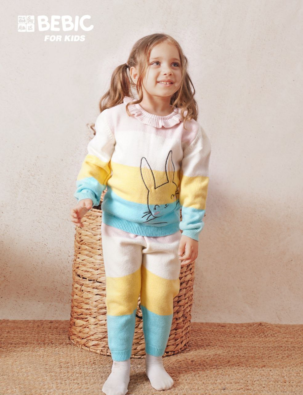 A soft and warm knitted set for infants (size months) consisting of a pullover and pants. It features a striped design in cheerful pastel colors (white, pink, yellow, and blue). The top is decorated with a large yellow bunny motif, with a collar adorned with soft pink ruffles. The pants are striped in the same colors. Designed for warmth and comfort, they feature easy-to-wear details such as an elasticated waistband.