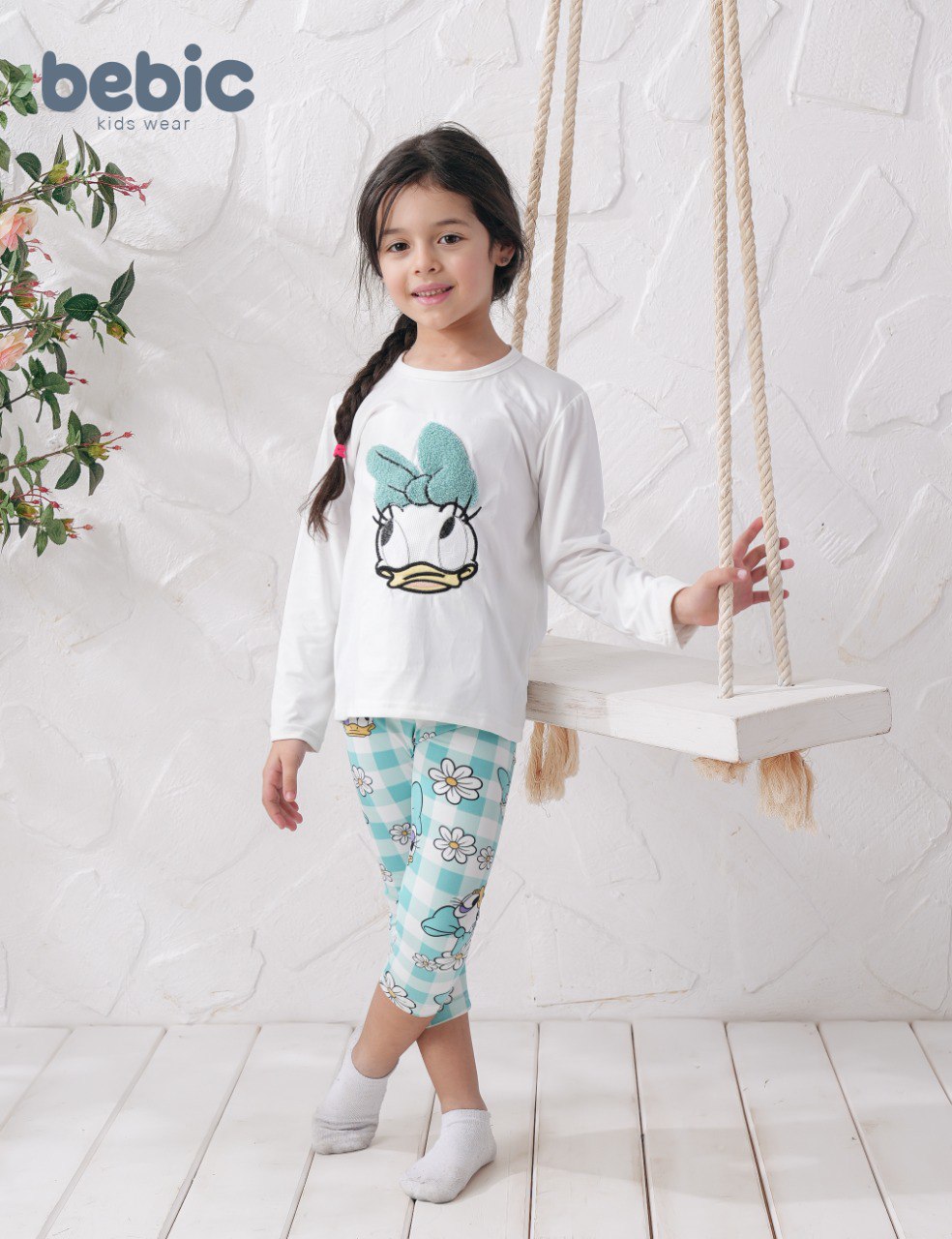 The pajama set consists of a white, long-sleeved T-shirt, decorated with a cute cartoon duck face and a light green bow, adding a playful and spontaneous touch. The short leggings feature a turquoise check pattern with white roses and small drawings that match the blouse's design, making the set lively and cheerful. The fabric feels comfortable and soft, perfect for sleeping or lounging around the house, and the bright colors add a lovely, childlike feel. This set is perfect for girls, exuding simple elegance with a fun, cartoonish touch.