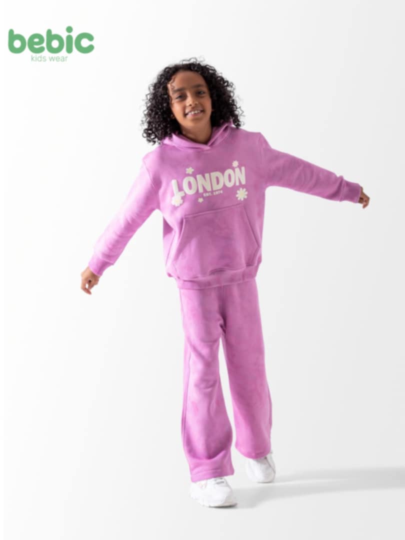 A stylish winter set for girls consisting of a hooded sweatshirt with a "LONDON" print and small floral motifs that add a playful touch, and comfortable wide-leg pants in the same color. Made of warm, soft fabric for all-day comfort, the set combines elegance and simplicity with a modern design, perfect for outings and cold days.