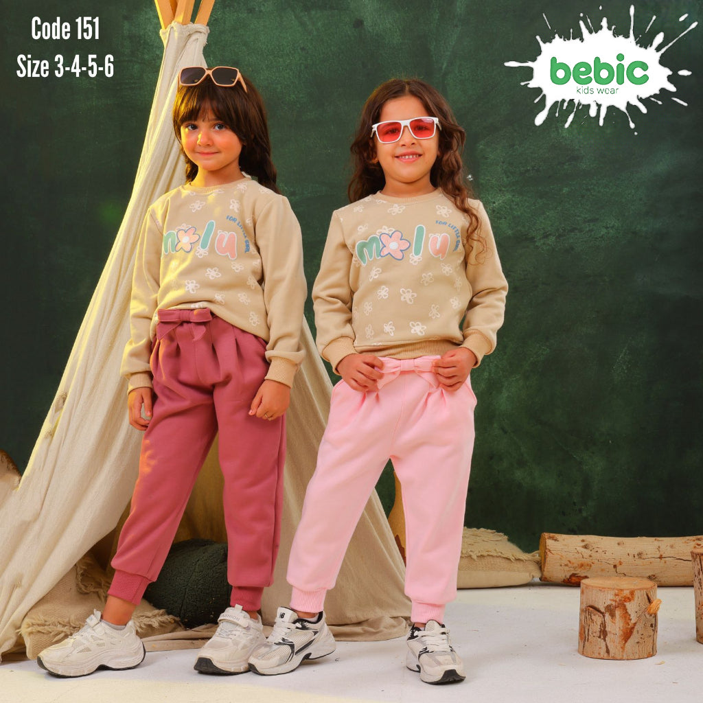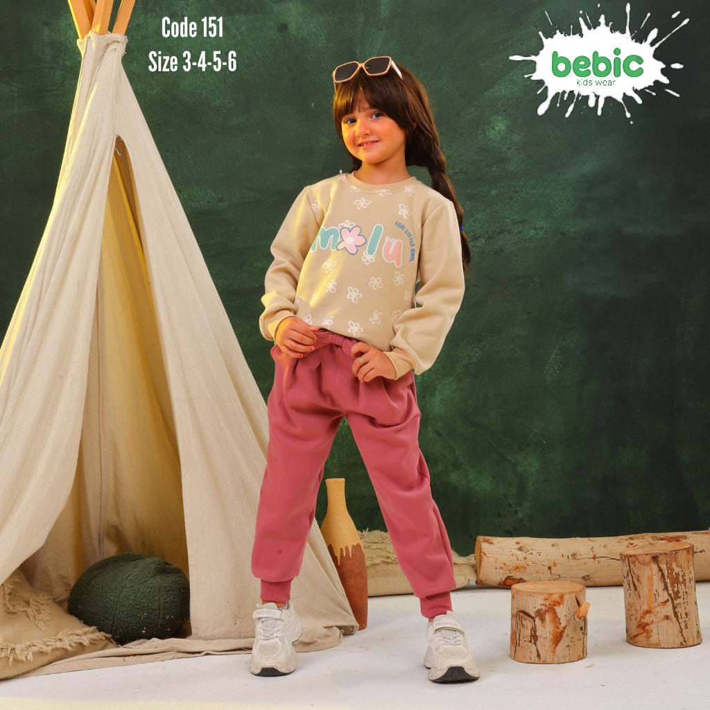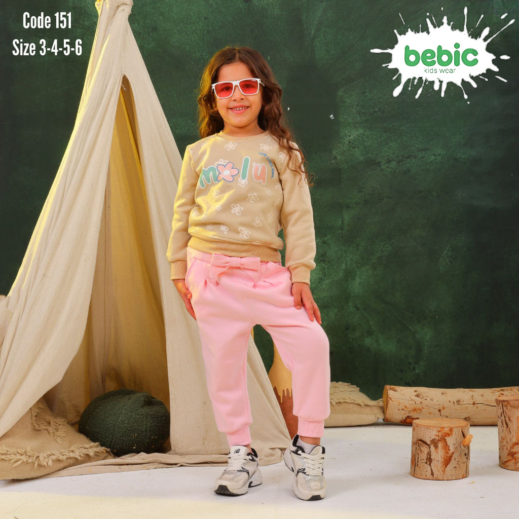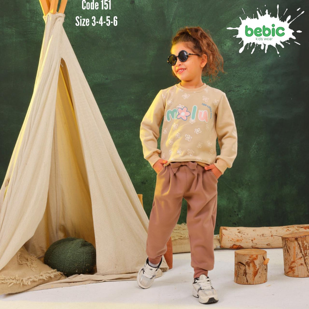 A stylish, casual girls' set featuring a beige sweatshirt emblazoned with a cute phrase and small floral prints, paired with high-waisted, lightweight pants with a front tie for a soft touch. The design is comfortable and suitable for everyday outings or simple outings, and the coordinated colors create a warm, modern look.