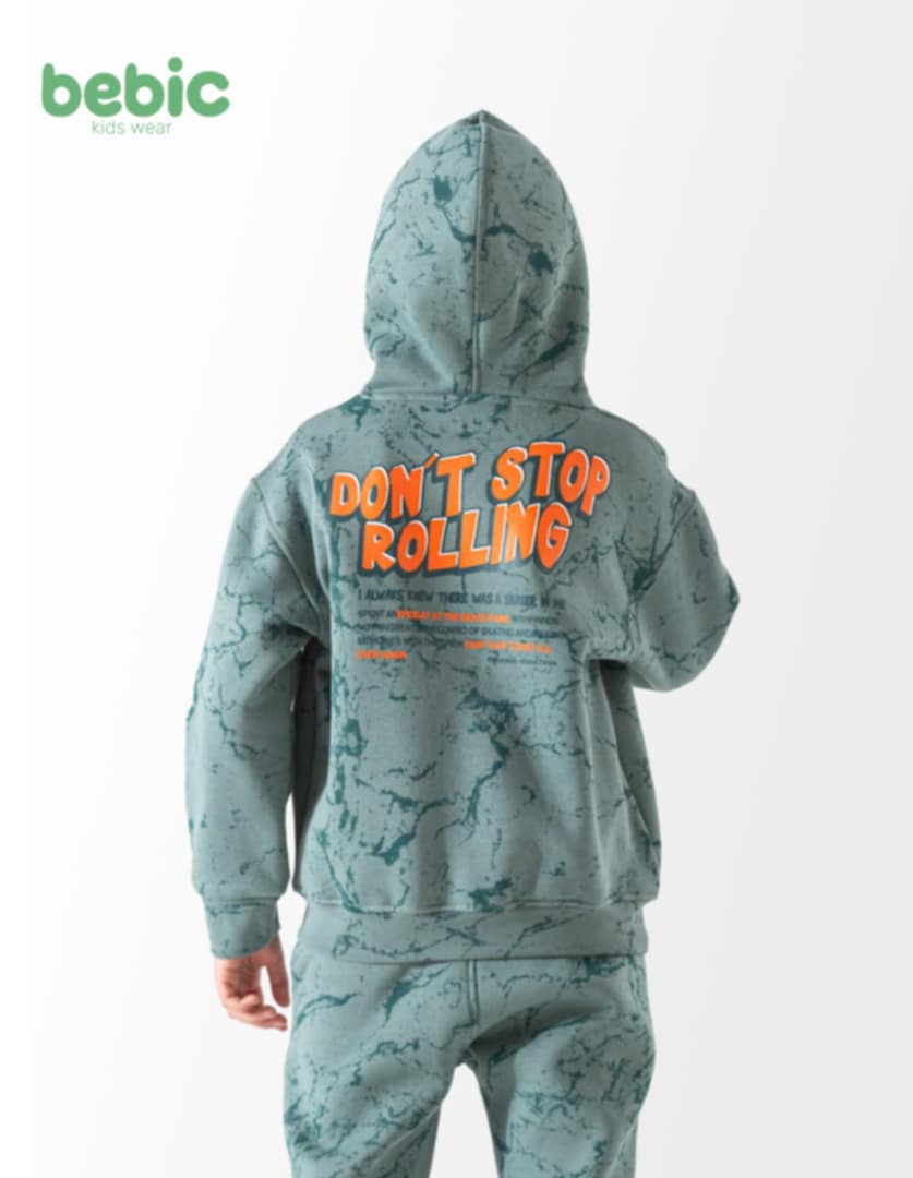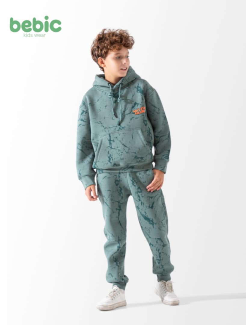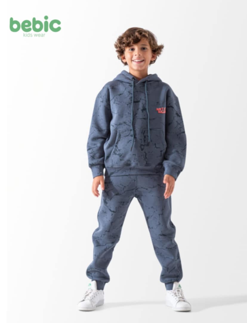 The set is a modern winter suit consisting of a hoodie and pants in the same distinctive pattern, featuring a comfortable and elegant design with a youthful touch. The material is soft and warm, and the marble- or paint-inspired pattern gives the set a bold and distinctive character, perfect for everyday looks or casual outings in cold weather.