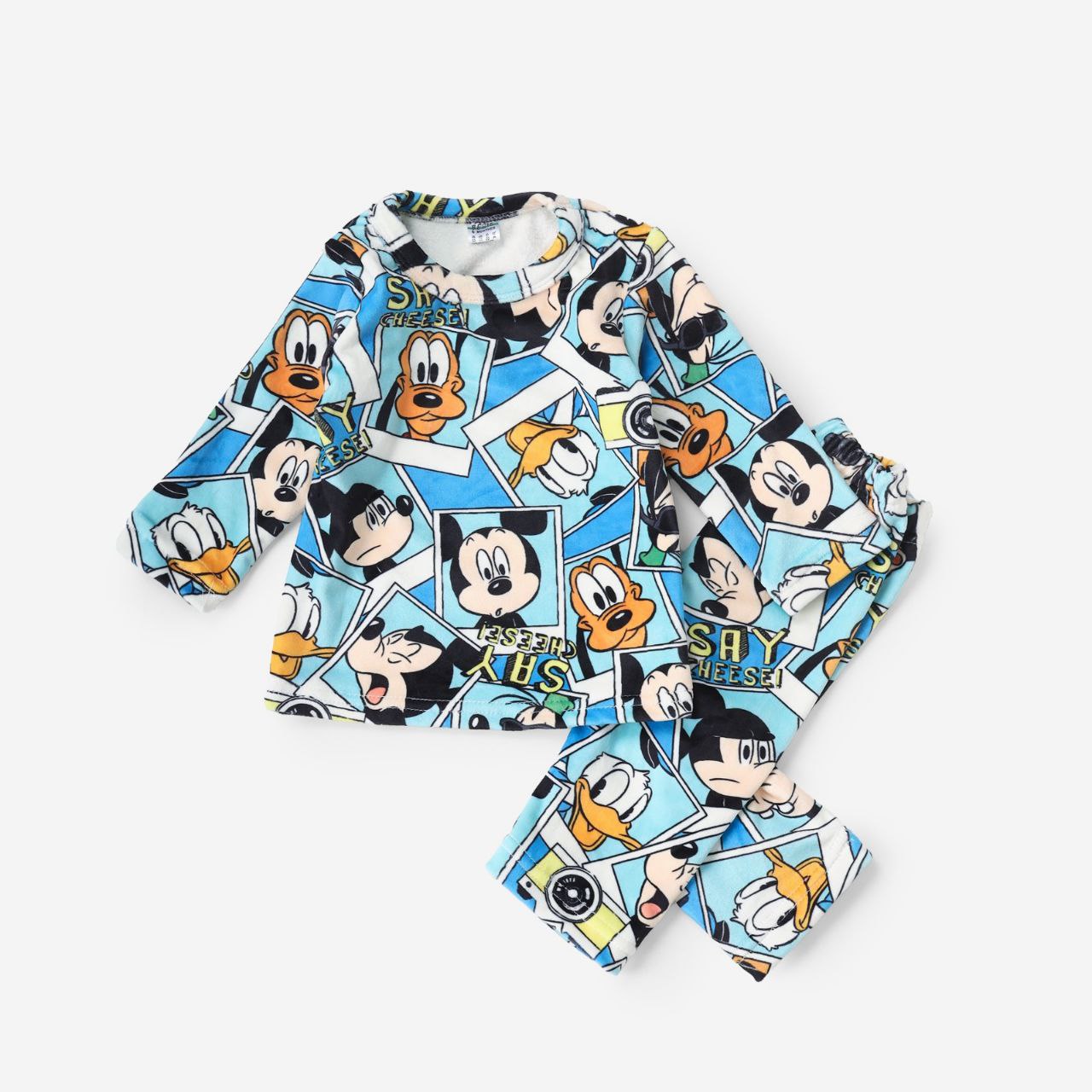 Made from soft, comfortable fabric, these pajamas feature an all-over print of popular Disney characters like Mickey Mouse, Pluto, and Donald Duck. They come in bright colors, predominantly blue with touches of black, white, and orange, giving them a fun and vibrant look. The top features long sleeves with a crew neck, and the pants feature an elastic waistband for comfort while sleeping or playing. These are fun and cheerful pajamas for kids.
