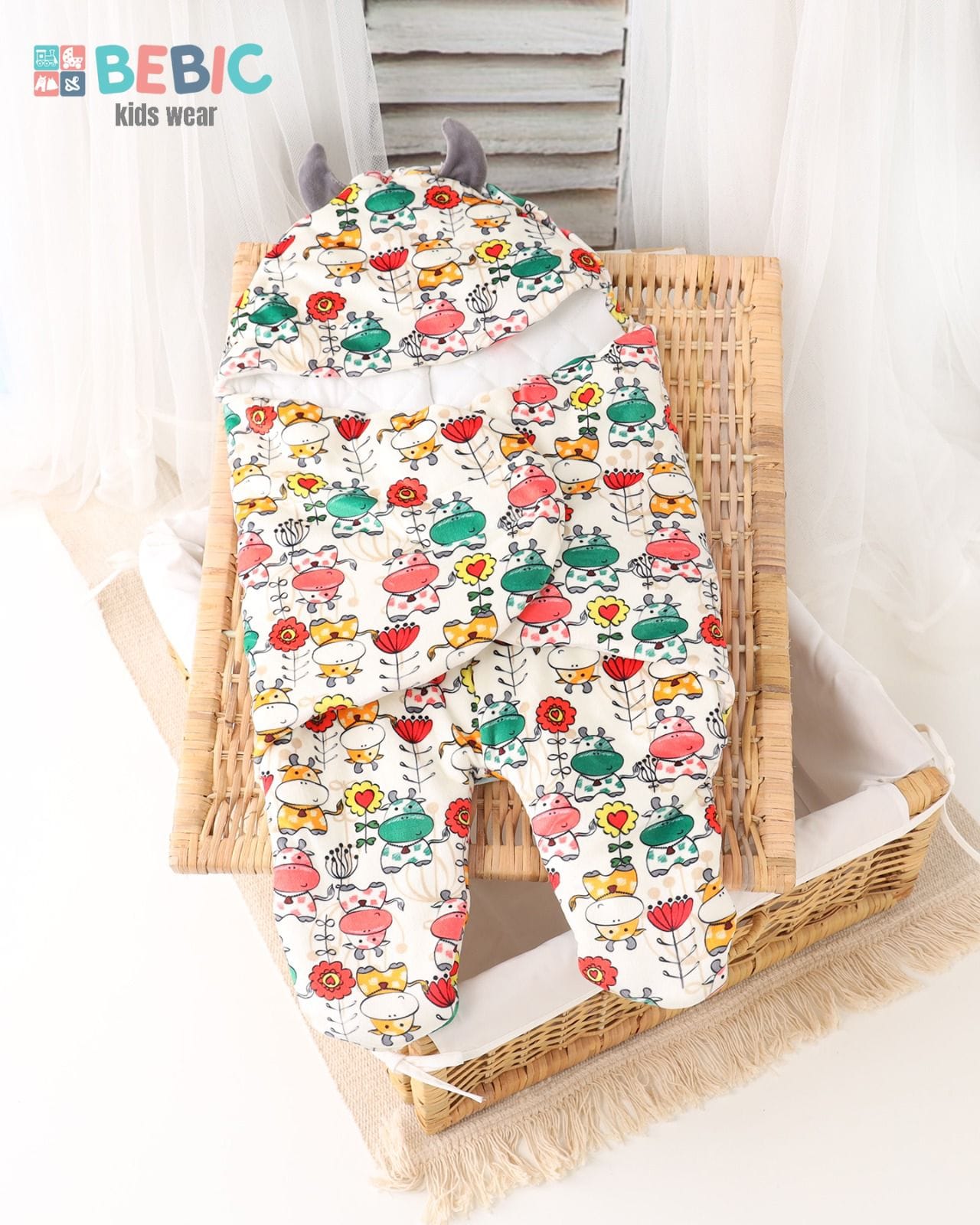 This blanket features a creamy white background and an attractive cartoon print featuring colorful little cows and red and green flowers. The hood adds a cute touch with two small gray horns.