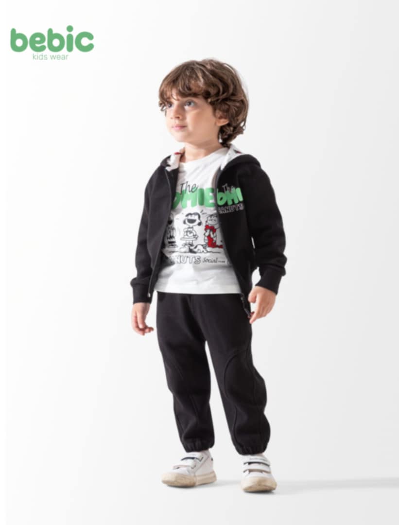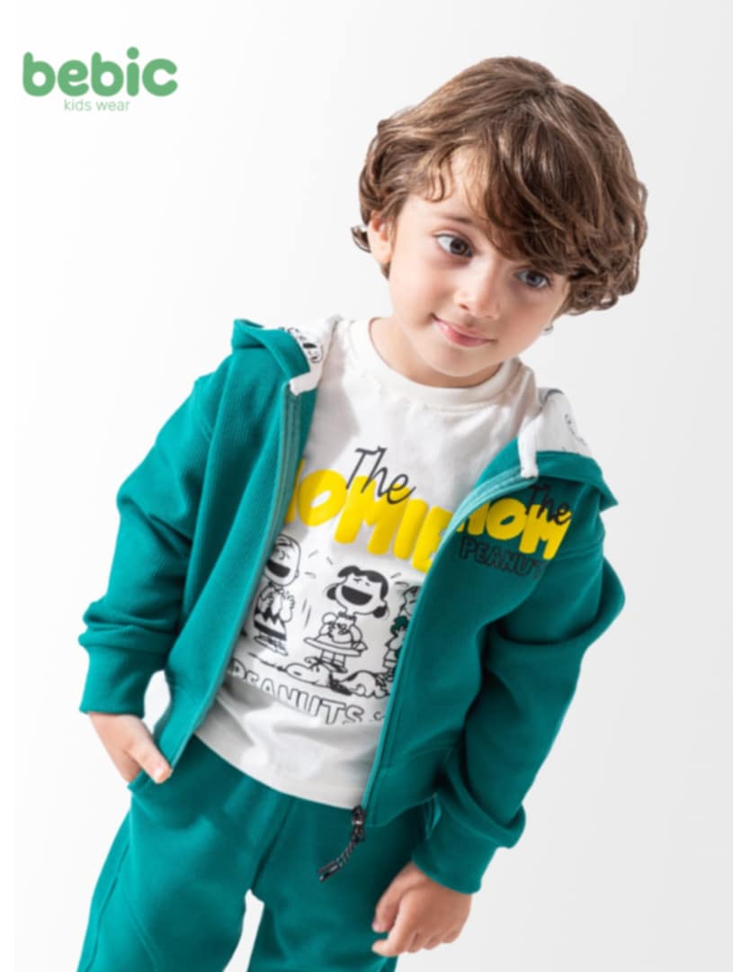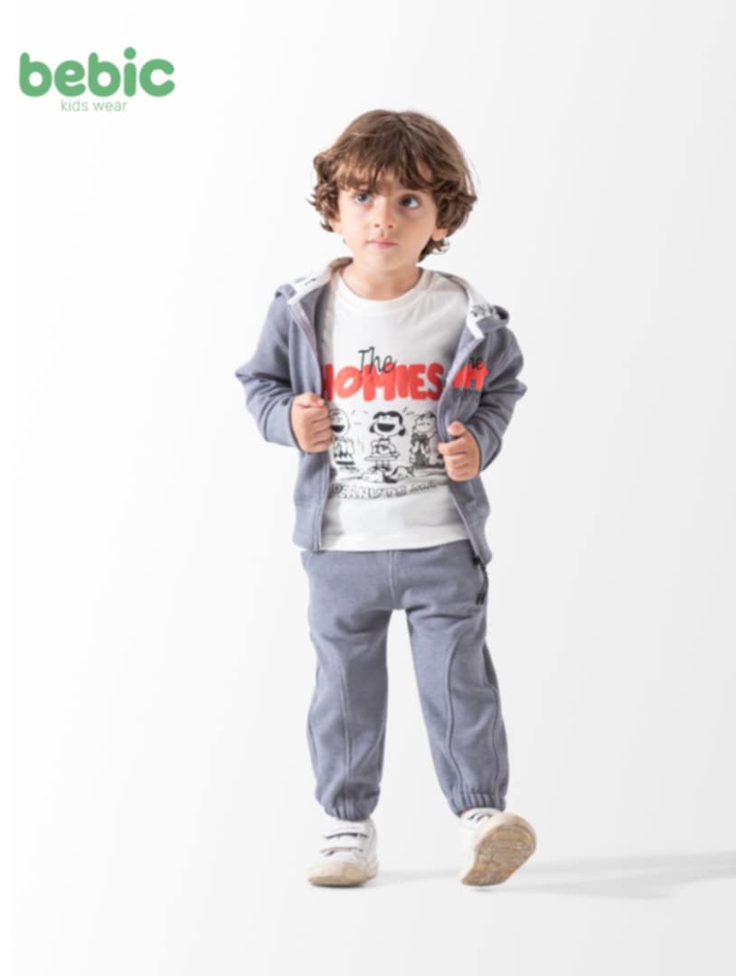 This stylish and comfortable three-piece set for boys includes a white T-shirt printed with fun cartoon characters, a zip-up sweatshirt that can be worn open or closed, and comfortable sweatpants with a drawstring waist. Available in several stylish colors, such as turquoise green, gray, and black, it creates a casual look perfect for everyday activities.