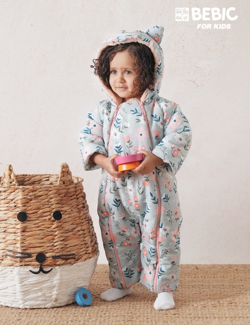 يتميز هذا الزي الثلجي المبطن بالكامل بخامة خارجية مقاومة للماء والرياح، مزينة بطبعة زهور على خلفية رمادية فاتحة. يحتوي التصميم على سحّابين أماميين مزدوجين يمتدان من الرقبة إلى الساقين لسهولة الارتداء وتغيير الحفاضات. كما يتضمن غطاء رأس ثابتًا ببطانة شيربا ناعمة وتفاصيل بارزة للأذنين، بالإضافة إلى أساور مطاطية عند المعصم والكاحل لعزل البرد وضمان ثبات الزي في مكانه أثناء الحركة.