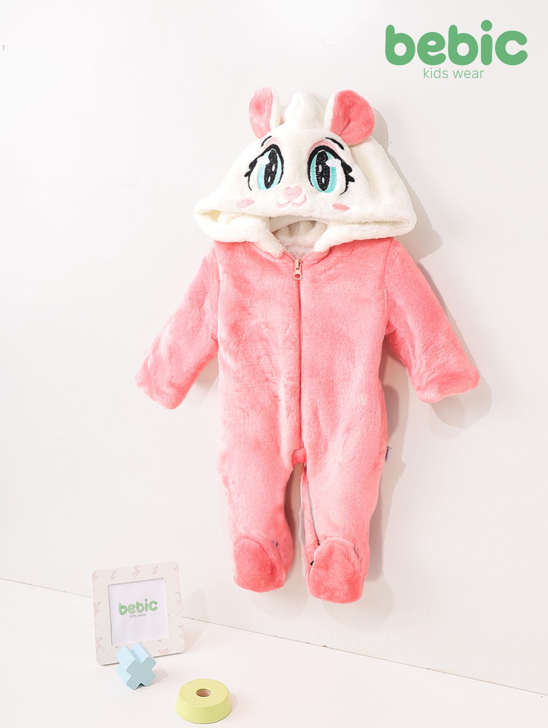 This adorable baby winter romper is made of soft, plush faux fur in a light pink (Baby Pink) color. The standout feature is a white hood shaped like a cartoon character's face with pink ears and large, expressive blue and black eyes. The romper is a solid color, fully covers the feet, and fastens with a convenient front zipper. It's perfect for keeping your little one warm and cozy in winter with a playful touch.