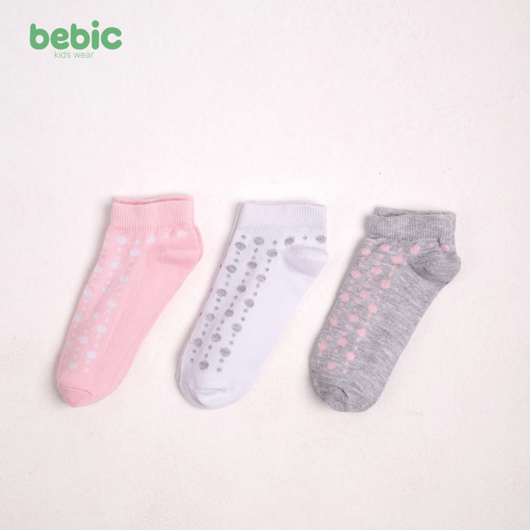The image shows three pairs of short children's socks (ankle socks) under . All three socks feature prominent dots on the sole to prevent slipping (non-slip/anti-slip). The first sock is light pink with white dots. The middle sock is plain white with grey dots. The third sock is light grey with pale pink dots. The socks are designed to provide safety and comfort for young children and are arranged neatly on a simple white background, highlighting the details of the anti-slip dots.