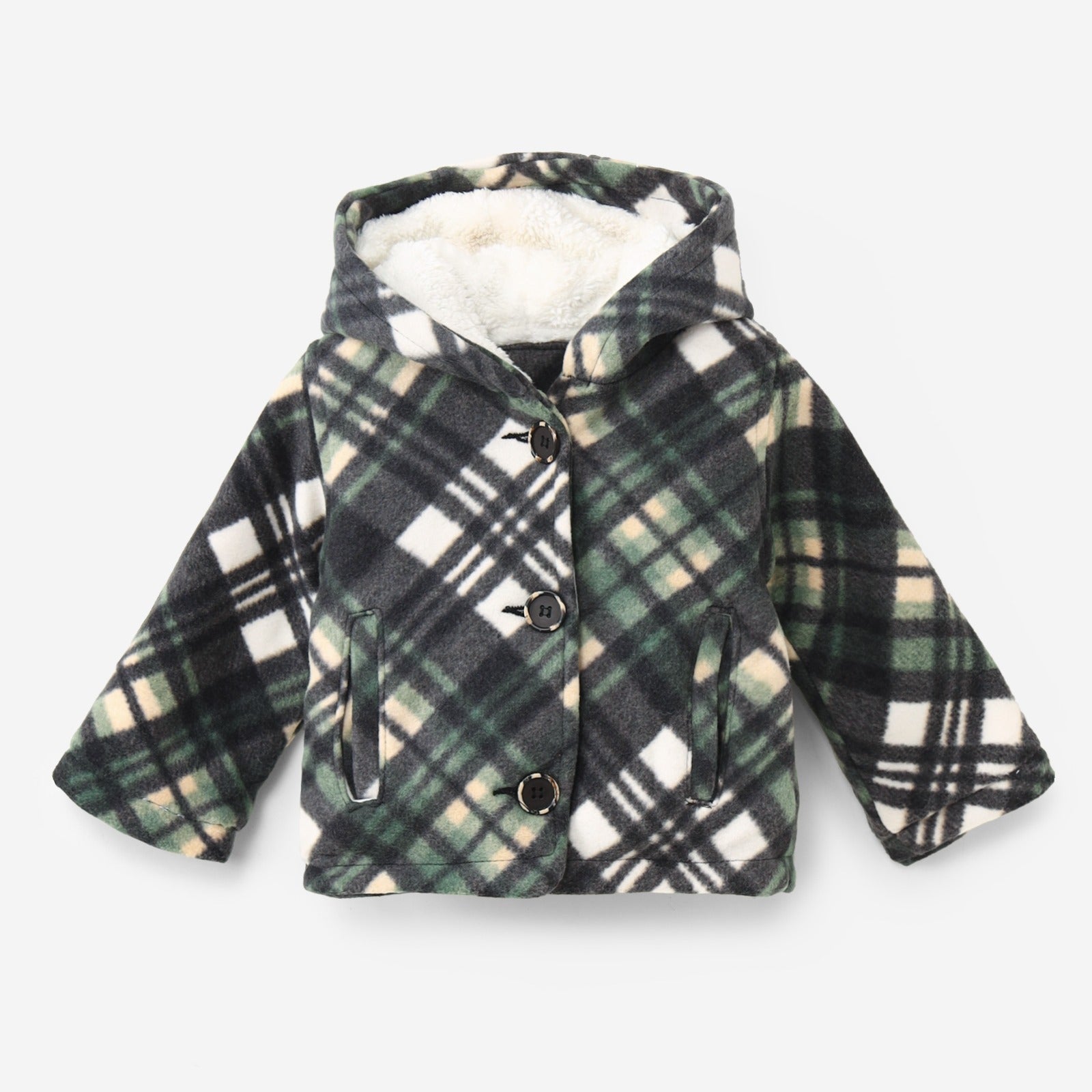 This is a children's hooded coat, made from thick wool/felt or a similar heavy fabric, featuring a Scottish plaid pattern in dark green, black, and cream. The coat is fully lined with soft white faux shearling for maximum warmth. It has a large button-front closure and small, mischievous side pockets.