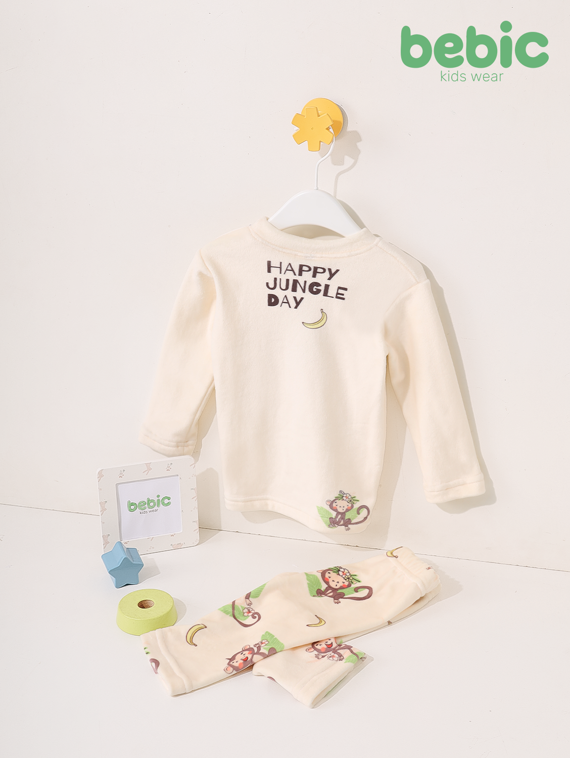 Embark on cozy jungle adventures with these soft, unisex pajamas. Featuring a soft Off-White colorway, the shirt features a central print of a cute monkey swinging from a tree branch holding a banana, along with the phrase "HAPPY JUNGLE DAY."The pants are a light beige color with a repeating monkey, banana, and leaf print. The two-piece set features long sleeves and legs and is made of warm and cozy velvet, perfect for playing or sleeping.
