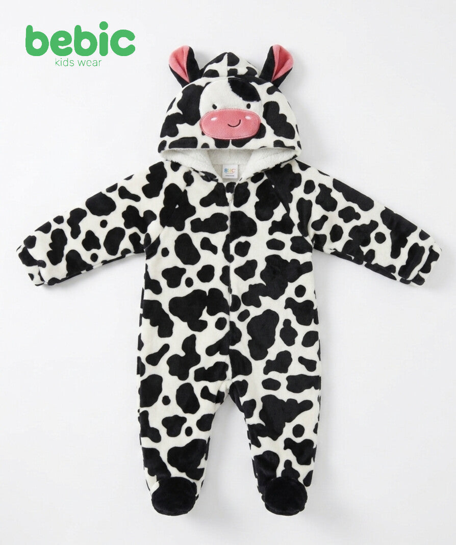 This collection of jumpsuits from Bebic combines perfect warmth with cheerful cartoon designs that add a touch of fun to your child's winter look. The first jumpsuit features a classic black and white cow print with a hood adorned with a cute cow face and pom-poms with pink accents, while the second jumpsuit boasts a warm pink polka dot pattern with a cute embroidered lamb character on the side. Both are made from soft, quilted sherpa fleece for ultimate comfort and have a long front zipper for easy dressing. The full-length jumpsuit also includes footed slippers to keep your little one warm and cozy, whether indoors or out.