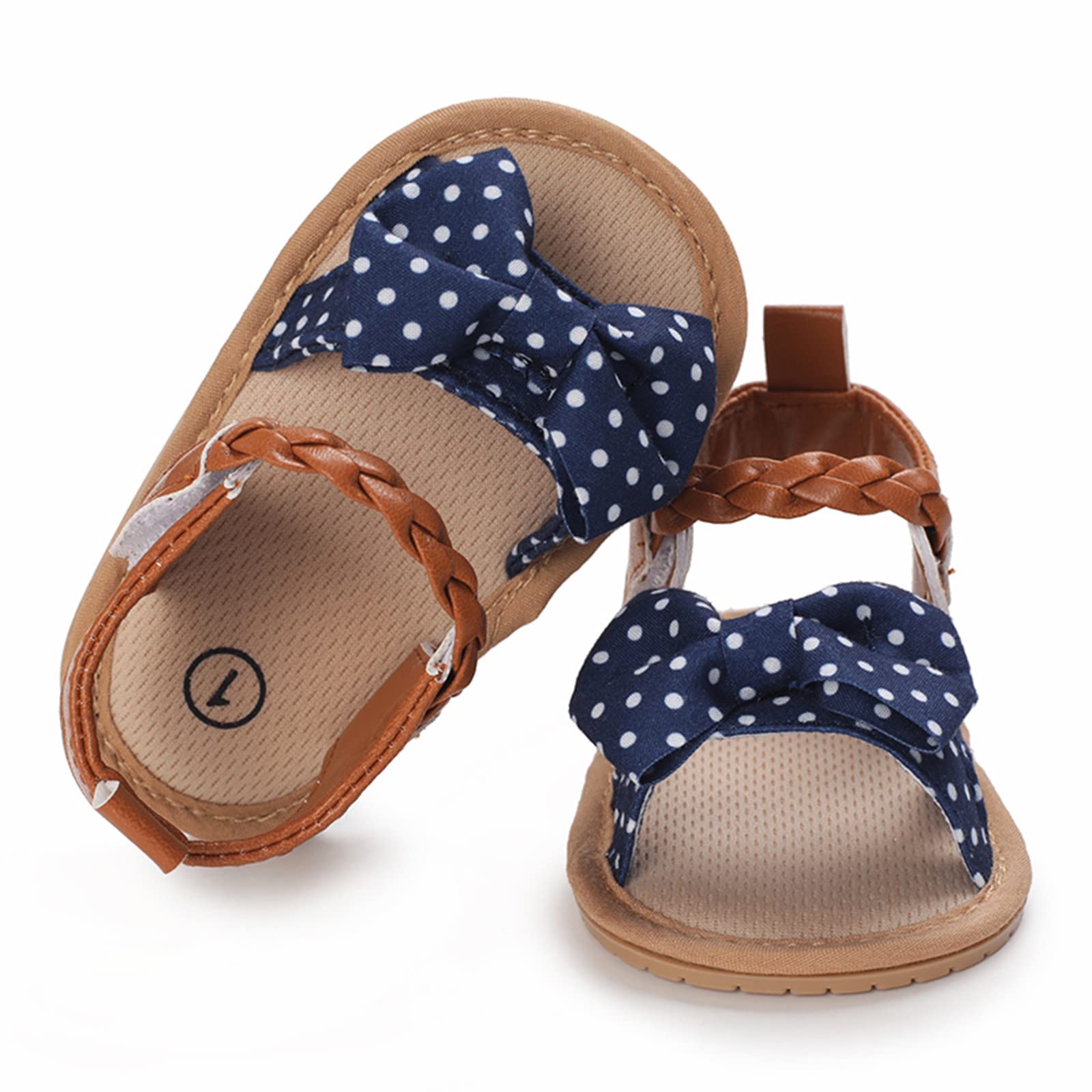 It features a front strap adorned with a large bow in navy blue and white polka dot fabric. The back strap and ankle strap appear to be crafted from burnt brown faux leather with a braided design. The insole is soft in a natural beige color, and the outer sole is flexible and suitable for infants. It has a fun and stylish look that is perfect for girls.
