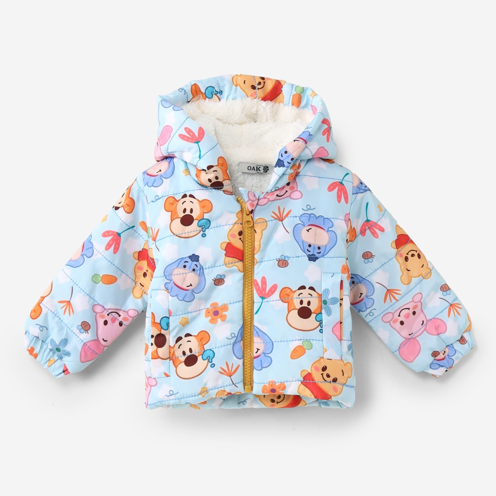 This is a warm, wintery puffer jacket for toddlers, complete with a hood. Its base color is baby blue. The jacket is covered in a colorful and cheerful print of Winnie the Pooh and his friends (like Piglet and Tigger) in a floral and cloudy setting. The hood is lined with soft white faux shearling for warmth. The jacket fastens with a light yellow front zipper and has two small side pockets.