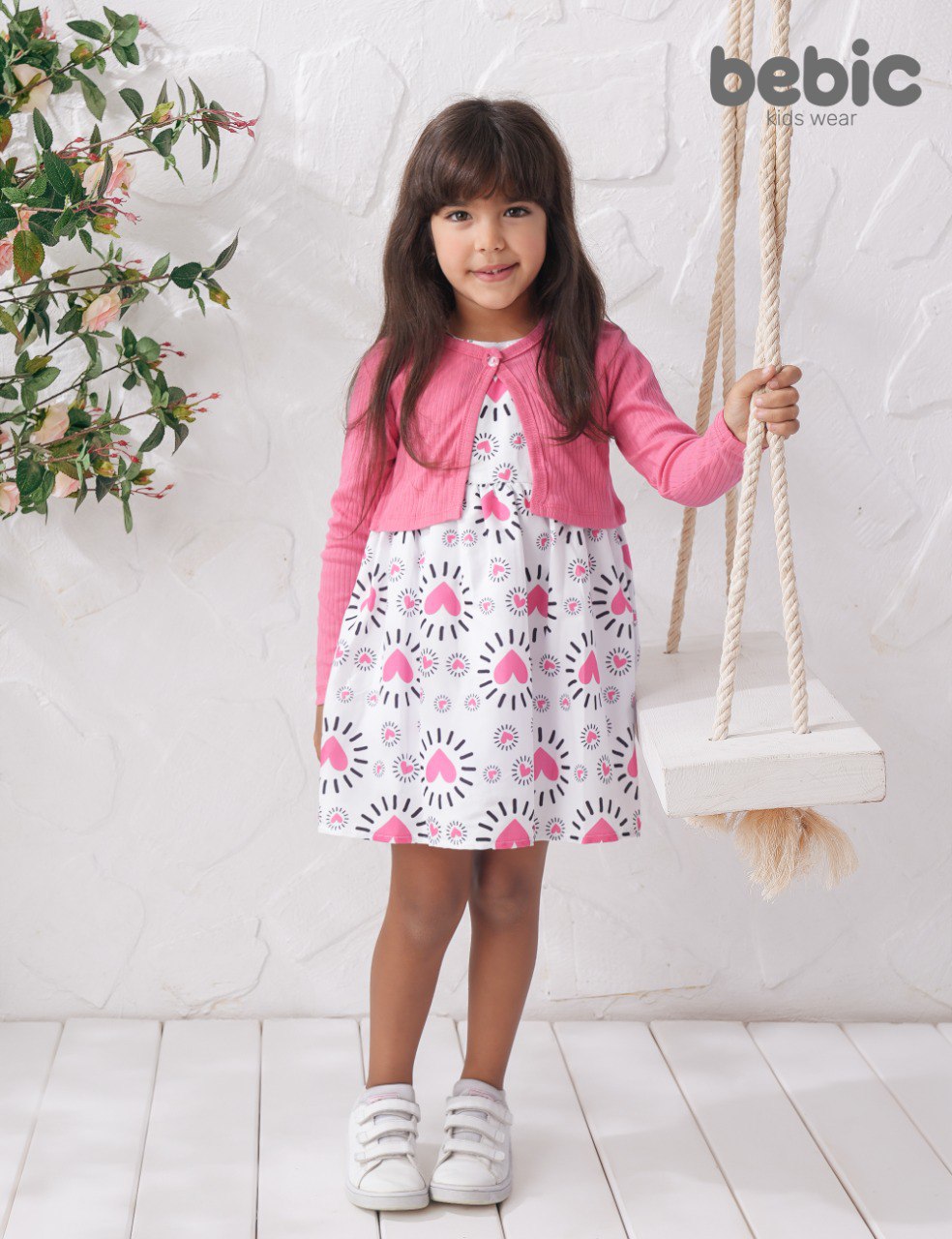 This dress combines simplicity and elegance with a playful touch, perfect for children. Its basic white color is embellished with large pink heart prints surrounded by black and pink radial motifs, giving it a lively and attractive look. Its loose, comfortable cut allows little ones freedom of movement throughout the day. It is paired with a short, vibrant pink cardigan with long sleeves and a simple front button, adding a chic and warm winter touch to the look. Practical and suitable for everyday wear or outings, the dress combines comfort, elegance, and the innocent spirit of childhood in one distinctive design.