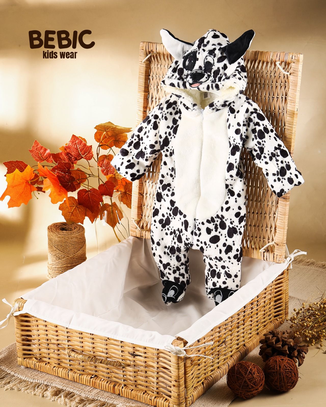 This cozy cotton set is a must-have for your child's winter wardrobe. It combines a playful "Laughing Cow" design in black and white with soft fleece fabric that provides perfect warmth and exceptional softness against delicate skin. The romper features charming details like a hood with adorable ears and googly eyes, a long front zipper for easy dressing and undressing, and closed cuffs to keep your child's feet warm. The roomy design allows for complete freedom of movement while playing or sleeping, making it the perfect choice for a stylish and cozy look on cold days.