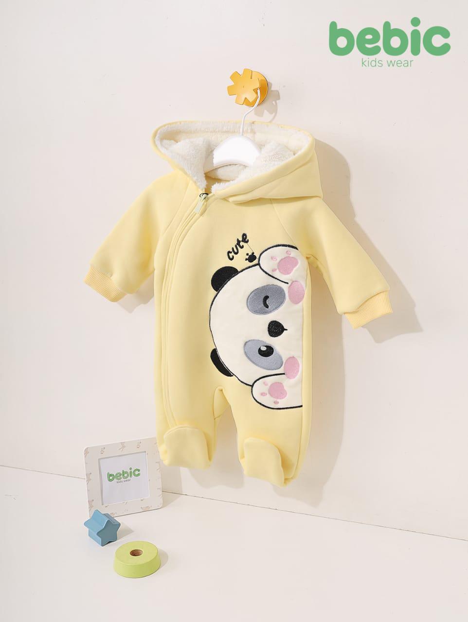 بدلة نوم شتوية صفراء زاهية، مصنوعة من قماش ميلتون سميك ومبطنة بالكامل بفرو شيربا أبيض ناعم لتوفير الدفء الأمثل. تتميز البدلة بطبعة بارزة جميلة لوجه باندا بتفاصيل وردية وكلمة "لطيف" في الأعلى. تصميمها عملي للغاية، حيث يعتمد على سحاب جانبي مائل لسهولة الارتداء، بالإضافة إلى غطاء رأس دافئ، وأساور معصم مضلعة، وأقدام مغلقة لضمان حماية الطفل الكاملة من تيارات الهواء الباردة.