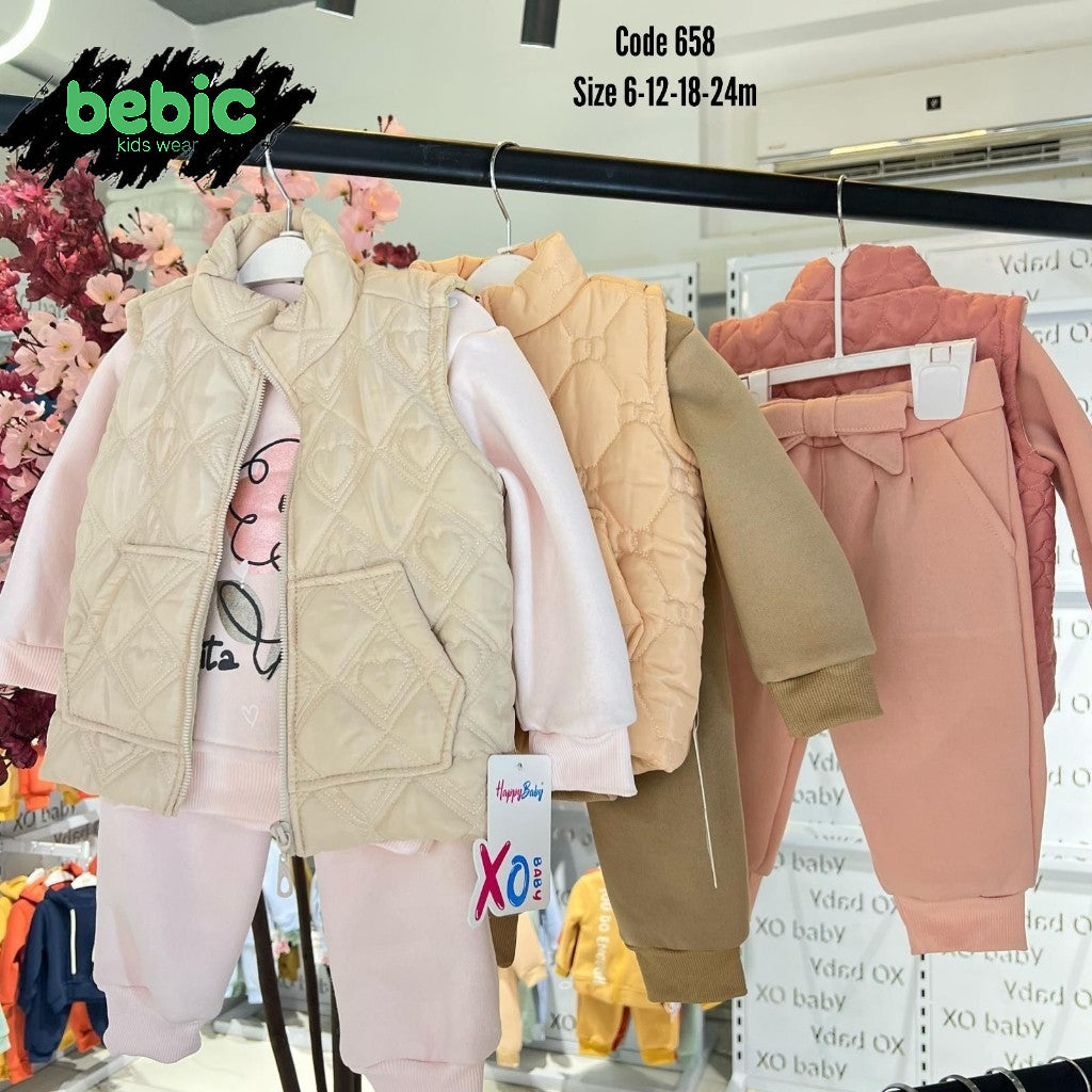 A stylish three-piece winter set for children: a soft cotton pullover with a cute print, comfortable pants of the same fabric, and a lightly quilted jacket with a heart pattern for warmth and style. The muted, coordinated colors are perfect for a warm and practical everyday look. Available in sizes 6 to 24 months.
