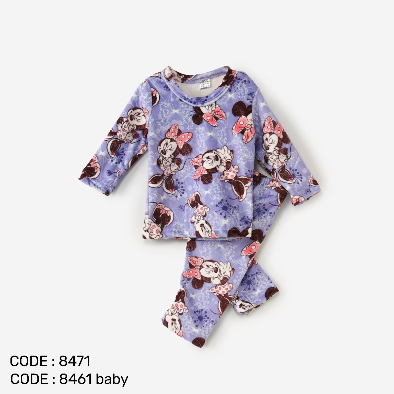 These cute and cheerful pajamas for kids are made of warm, soft fabric, perfect for winter days. They feature a top and pants in the same distinctive purple pattern. The prints feature beloved cartoon characters, adding a fun and cute touch, and the bright colors make them cheerful and comfortable to wear.